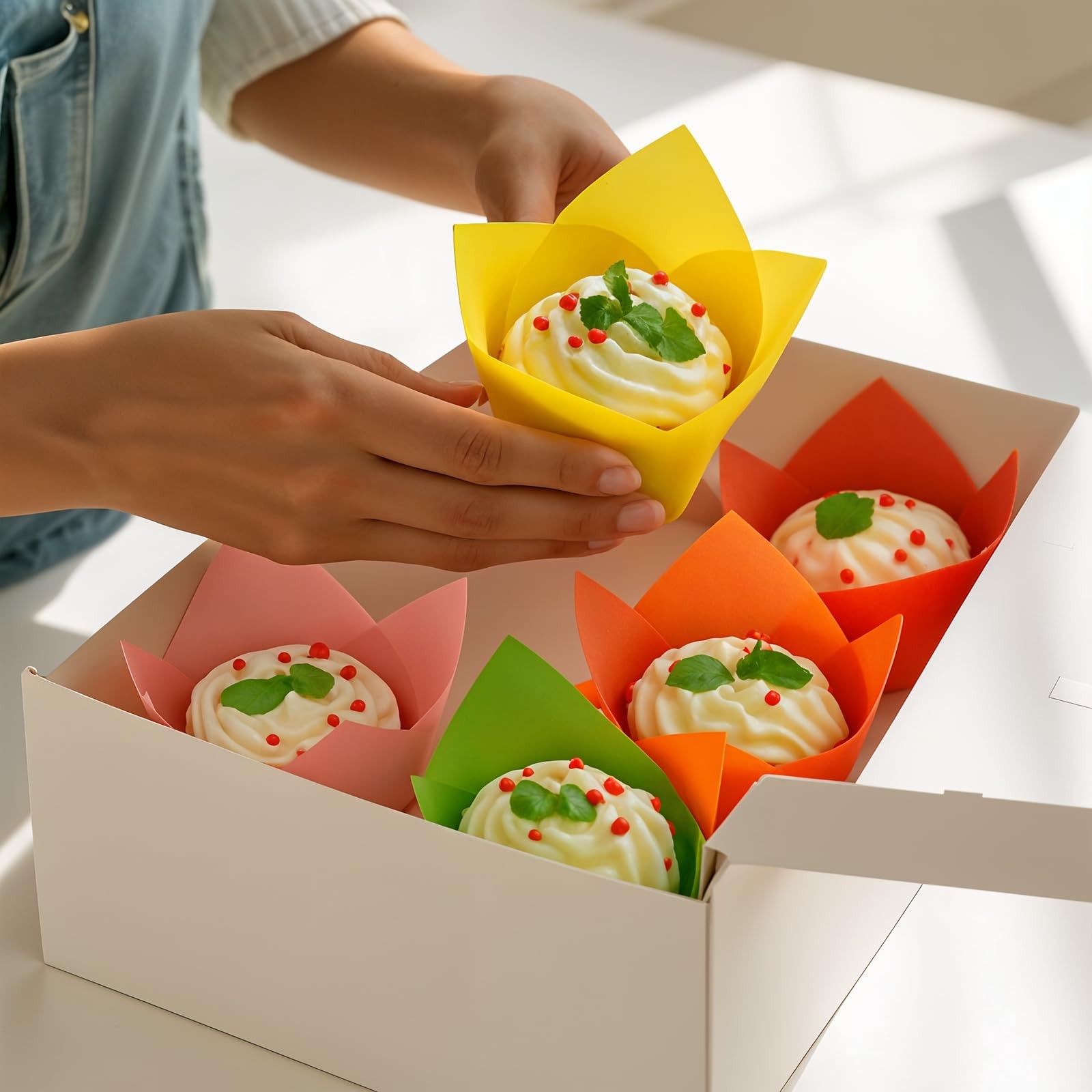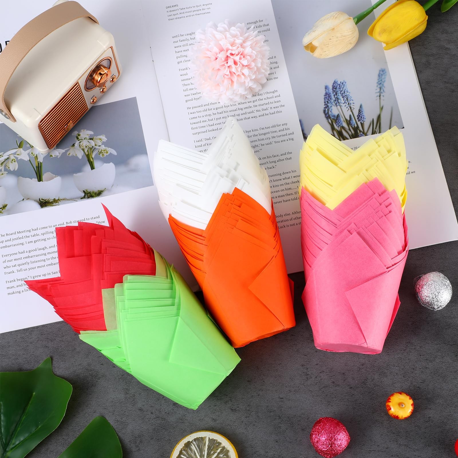 Extensive Use: these tulip liners for muffins are nice for everyday use or some events, such as birthdays parties, weddings, Christmas themed party and other holidays, you can use them to treat your guest Assorted Products to Meet Your Needs: you will receive 600 pieces of baking cups in your package with 6 different colors, including red, pink, yellow, green, white, and orange , suitable for you to decorate your party Specifications: Material: paper Color:Multcolors Size: 2 x 2.1-3.1 inches Package includes: 600 x Baking Cups Notes: Manual measurement, please allow slight errors on size. The color may exist a slight difference due to different screen displays. Assorted Products to Meet Your Needs: you will receive 600 pieces of baking cups in your package with 6 different colors, including red, pink, yellow, green, white, and orange , suitable for you to decorate your party Safe and Quality Material: the tulip cupcake holders apply paper material, they can withstand temperatures up to 220 degrees Celsius/ 425 degree Fahrenheit when baked, safe to use in the oven. Non sticky and no need for pre lubrication, easy to separate from cake. Greaseproof paper will make you enjoy your cupcake or muffin Size Information: these tulip cupcake wrappers measures approx. 2 inches in diameter at the bottom, about 2.1-3.1 inches in height. It has a capacity of about 3 ounces, which can place the standard muffins or cupcakes Elegant Appearance Design: these paper tulip cupcake liners are printed with streamlined patterns and adorable colors, giving your muffin or cupcake an attractive look, suitable for for showcasing cupcakes at parties Extensive Use: these tulip liners for muffins are nice for everyday use or some events, such as birthdays parties, weddings, Christmas themed party and other holidays, you can use them to treat your guest