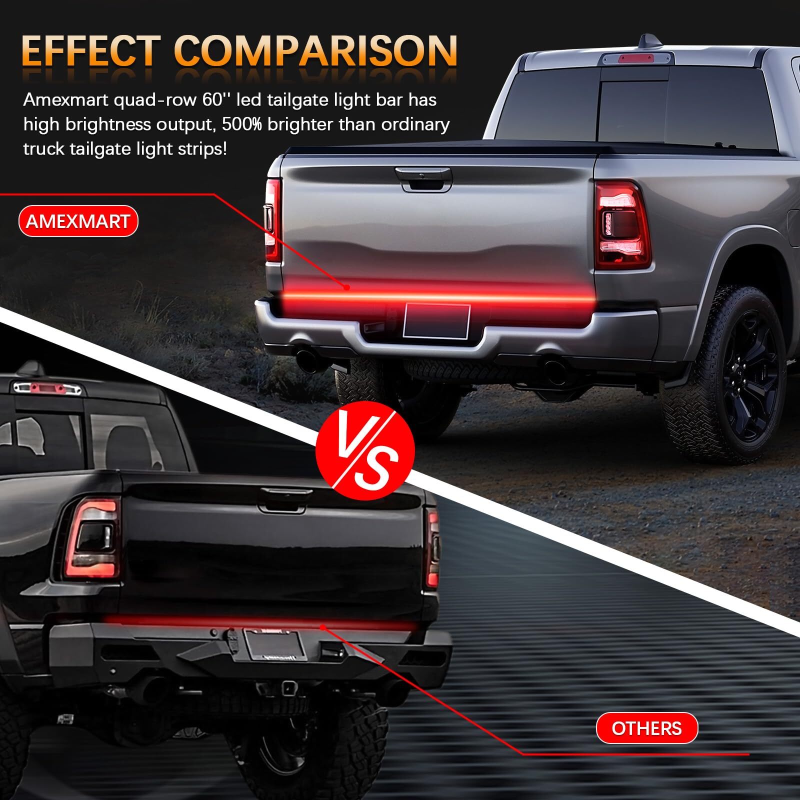 60 Inch LED Tailgate Light Bar with Reverse & 60" Triple Row Flexible Strip 【Multi-function Design】 Amexmart tailgate light bar comes with red running light, red brake light, white reverse light,amber left/right turn signal light. When you turn on the left and right turn lights at the same time will produce a double flash function, this is a normal effect. 【Excellent Brightness】Quad-Row 60 Inch truck tailgate light bar adopts 648pcs high quality LED chips, which makes the lumen output is 500% brighter than normal tailgate light strip,and ensures your trucks/cars can be seen even in the heaviest traffic of the day or night. 【Premium Material】Quad row led tailgate light strip is made of top quality IP68 waterproof rated silicone and durable rust resistant materials to help withstand all weather conditions. These 60'' tailgate light bars are super durable with a lifespan of over 50,000 hours. 【Easy Installation】Our tailgate led light bar has well conductive standard 4-pin flat plug and Self-Adhesive tape. No drilling required, Plug and Play stick-on installation. 【Wide Application】These truck tailgate led light strips operate on 12V DC and 60 inches long,compatible with Dodge Ram 1500 2500, 3500, 4500, Ford F150, F250, Chevy, Silverado, GMC, Sierra, and most trucks, Pickups, towing vehicles, cars, SUV, RV, Van, trailers, etc. Our tailgate light strip is also a beautiful and practical auto parts gift for your father/husband/brother/son/friend. 【Special Note!! 】If you connect a 4-pin tailgate light bar to a 7-pin connector using a 7-pin to 4-pin adapter, our 60 inch tailgate light bar may not work properly. To avoid this, you need to purchase a "7 Pin to 4 Pin Trailer Adapter" or "7 Pin to 4 Pin Trailer Harness with Reverse 12V Wire ". Shipping We offer FREE shipping on all orders! We ship within Three business days of payment, usually sooner. We use a selection of shipping services such as UPS, FedEx, USPS etc. We only ship to the lower 48 states, no APO/FPO addresses or PO Boxes allowed. Local pickups and combined shipping options are not provided at this time. Return You can return a product for up to 30 days from the date you purchased it. Any product you return must be in the same condition you received it and in the original packaging. Please keep the receipt. Payment We accept payment by any of the following methods: PayPal Please pay as soon as possible after winning an auction, as that will allow us to post your item to you sooner! Feedback Customer satisfaction is very important to us. If you have any problem with your order, please contact us and we will do our best to make you satisfied. Contact Us If you have any queries, please contact us via ebay. We usually respond within 24 hours on weekdays. Please visit our eBay store to check out other items for sale! Thank you for shopping at our store.