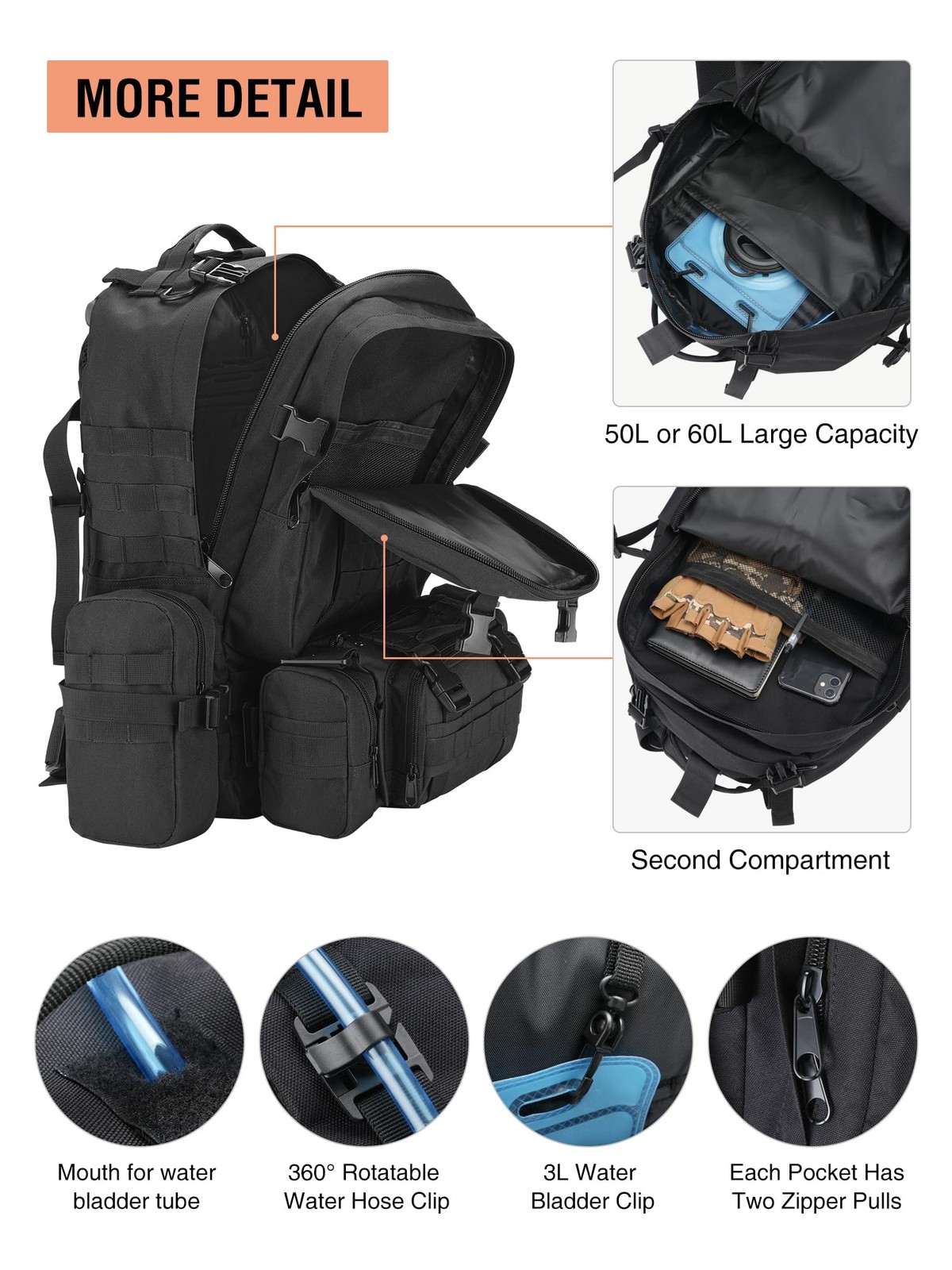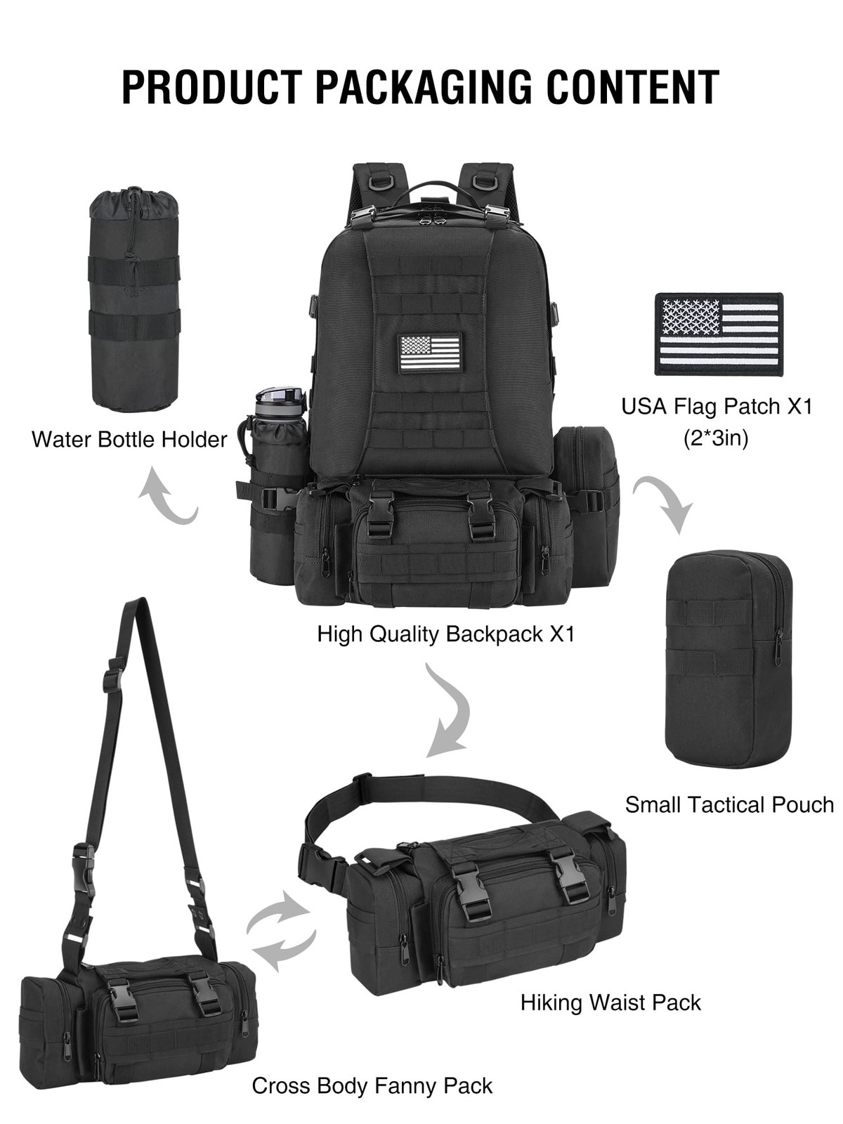 TACTICAL BACKPACK 50L/60L WITH 3 DETACHABLE POUCHES Whether you're on a military mission or a weekend getaway, this 50L-60L tactical backpack helps you manage and secure your personal items well. Molle webbing system provides possibility for you to carry additional survival kits, outdoor adventure gears, or other small gadgets. Ample and spacious enough for the items you want to carry. Can work as 72-hour survival kit backpack, range bag, hunting backpack, army camouflage backpack, survival backpack, camouflage army backpack, hiking trekking backpack, camping rucksack, outdoor backpack or day pack for daily use. Adjustable Buckle: Provides Greater Security & Stability. You can freely bundle the items you want on the backpack. Heavy-duty Zippers--Durable, not easy to break. Smooth, easy to open and close. Mouth for water Bladder Tube--Tactical backpack with hydration bladder for your drinking needs. Strong Stitching--Double strong stitching, making the seams of the backpack strong and secure, and not easy to be torn. You can use Three DETACHABLE Bags Separately 1. Detachable Molle Water Bottle Holder Bag Side Water Bottle Bag approx: 9.06"(23cm)High, fits 3.35"(8.5cm) dia bottle. Precise design enables it to fit most standard size water bottles, such as sport bottle, water bottle, beverage bottle, etc. 2. Detachable Crossbody Bag Front Pocket approx: 5.1"(13cm) High x 12.6"(32cm) Wide x 3.9"(10cm) Deep One front DETACHABLE bag which can be used as a tactical fanny pack separately. Detachable Molle Utility Bag Side Molle Pocket approx: 7.9"(20cm) High x 4.7"(12cm) Wide x 2.4"(6cm) Deep 2. One side DETACHABLE tactical backpack accessories molle bags which can be used as first aid bags. Survival Backpack Combat Molle Backpack with Several Zipper Compartments High density polyester with waterproof lining, two-way heavy duty zipper closure. 50L or 60L Combined Backpack: Main compartment size: 13"*19.7"*8.7"/33*50*22CM(W*H*D). Our large military tactical backpack is combined with 1 x front detachable bag which can be used as a tactical fanny pack separately. Comfortable & Hydration Compatible: Our military backpack have strengthened stitching, side and front load compression system, ventilated mesh padded shoulder strap, breathable and comfortable. Multi- purpose: Large main compartment with hanging clips for your hydration bladder. Tactical backpack for men and women can be used as 3 day assault pack, hunting backpack, travel backpack or just for house-moving. Molle System: tactical backpack makes mission-ready tactical gear built to last. This tactical military backpack has molle system, molle webbing throughout for attaching additional tactical pouches or gear.