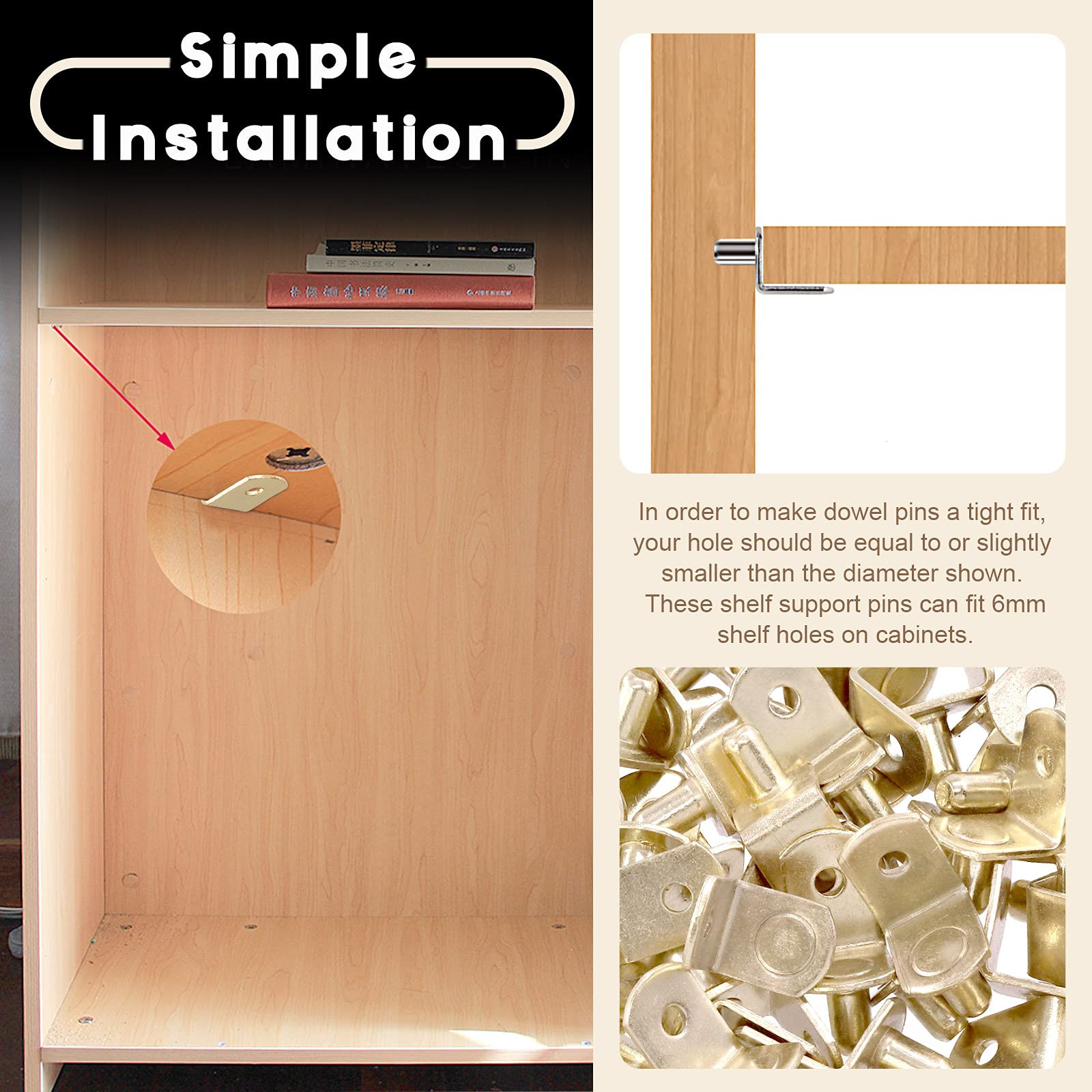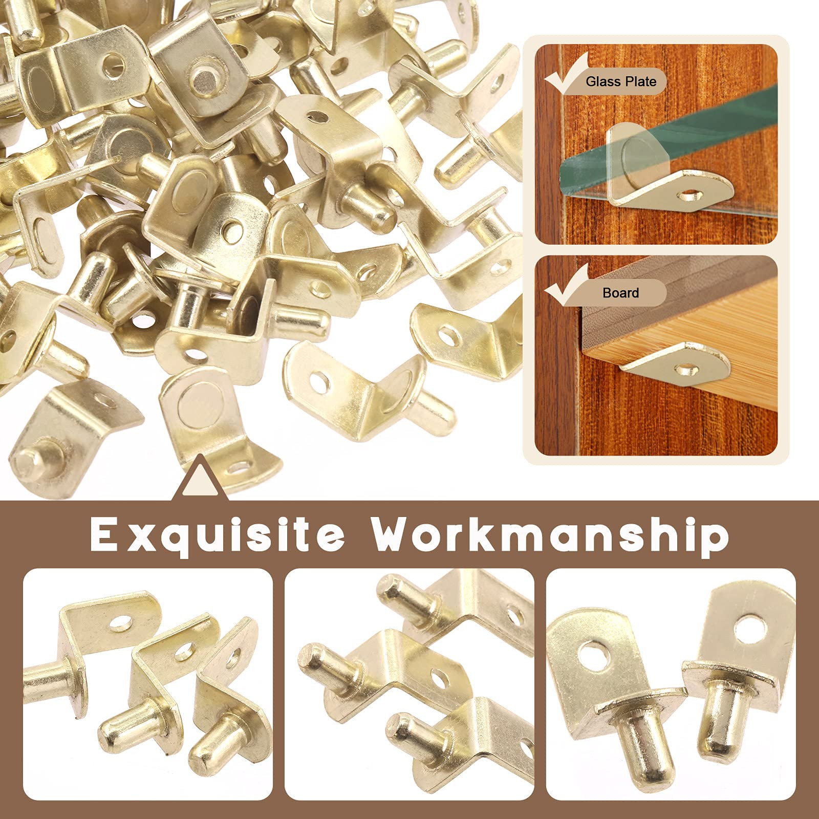 π₯ 60Pcs 1/4"" Gold Plated Steel L-Shelf Support Pegs with Hole Kit, L-Shaped Bracket Cabinet Shelf Support Pegs Shelf Pins Support Assortment Kit π₯ Why Choose Us? π£ 1, It include 60pcs Gold shelf pins which is 6 mm/ 0.24 inch in diameter, color is As shown in the picture. Material: Nickel-plated stainless steel , good quality and durable for long using life. π£ 2, Unique Design: L-Shaped design keeps the pin firmly seated in the cabinet holes, eliminating the chance of tear-out . Also small hole allows the use of a screw to permanently secure the shelf. π£ 3, Warm notice: in order to make dowel pins a tight fit, your hole should be equal to or slightly smaller than the diameter shown (less than or equal to 6 mm). π£ 4, Wide Application: Especially for cabinet, bookshelf, display cabinet, furniture, wardrobe, closet, cupboard, bookcase, pantry shelving, etc. π₯ Specifications: β Material: Iron with nickel plated β Color: As shown in the picture β Bracket Style Shelf Support: β Diameter: 6 mm/ 0.24 inch β Pin length: 10 mm/ 0.40 inch β Shelf Rest Length: 17 mm/ 0.67 inch β Shelf Rest Width: 13 mm/ 0.51 inch π₯ Use Steps: π£ 1. Ues a electric drill to punch, please use the 6mm bit. π£ 2. Put the shelf pin into the hole. π£ 3. If the diameter of the hole is bigger then the shelf pin, you can wrap a circle around it. π£ 4.Place the baffle on the shelf pin. π₯ Package Included: β§ 60pcs Γ L shape Bracket Style Shelf Support β€ 60Pcs in total π₯ γ What You Get γ ------ In this kit, You will get 60Pcs 1/4" Gold Plated Steel L-Shelf Support Pegs with Hole Kit. Made of High Quality solid steel with an antique brass finish that will beautiful compliment any wood. π₯ γ Product Specifications γ ------ Shelf pins fits all cabinets with 1/4 Inch holes. L bracket diameter is 6.35mm/ 0.25 inch, pin length is 8 mm/ 0.30 inch, and the shelf rest is 19 mm/ 0.74 inch in length, 13mm/ 0.5 inch in width, Please make sure the thickness of the cabinet will not lower than it. π₯ γ More Safety Designγ ------ "L" shaped design engages the side of the shelf, forcing the pins to remain in the holes. Small hole allows the use of a screw to permanently secure the shelf.The unique design keeps the pin firmly seated in the cabinet holes, eliminating the chance of tear-out. π₯ γ High Qualityγ ----- Good quality stainless steel and polished nickel, surface is smooth without burrs, will not easily rust and oxidized, hard and durable for long time use. π₯ γ Wide Application γ----- Shelf support for cabinets are very easy to install by hand, you can use them for cabinet, bookshelf, display cabinet, furniture, wardrobe, closet, cupboard, bookcase, pantry shelving, meet your daily needs.