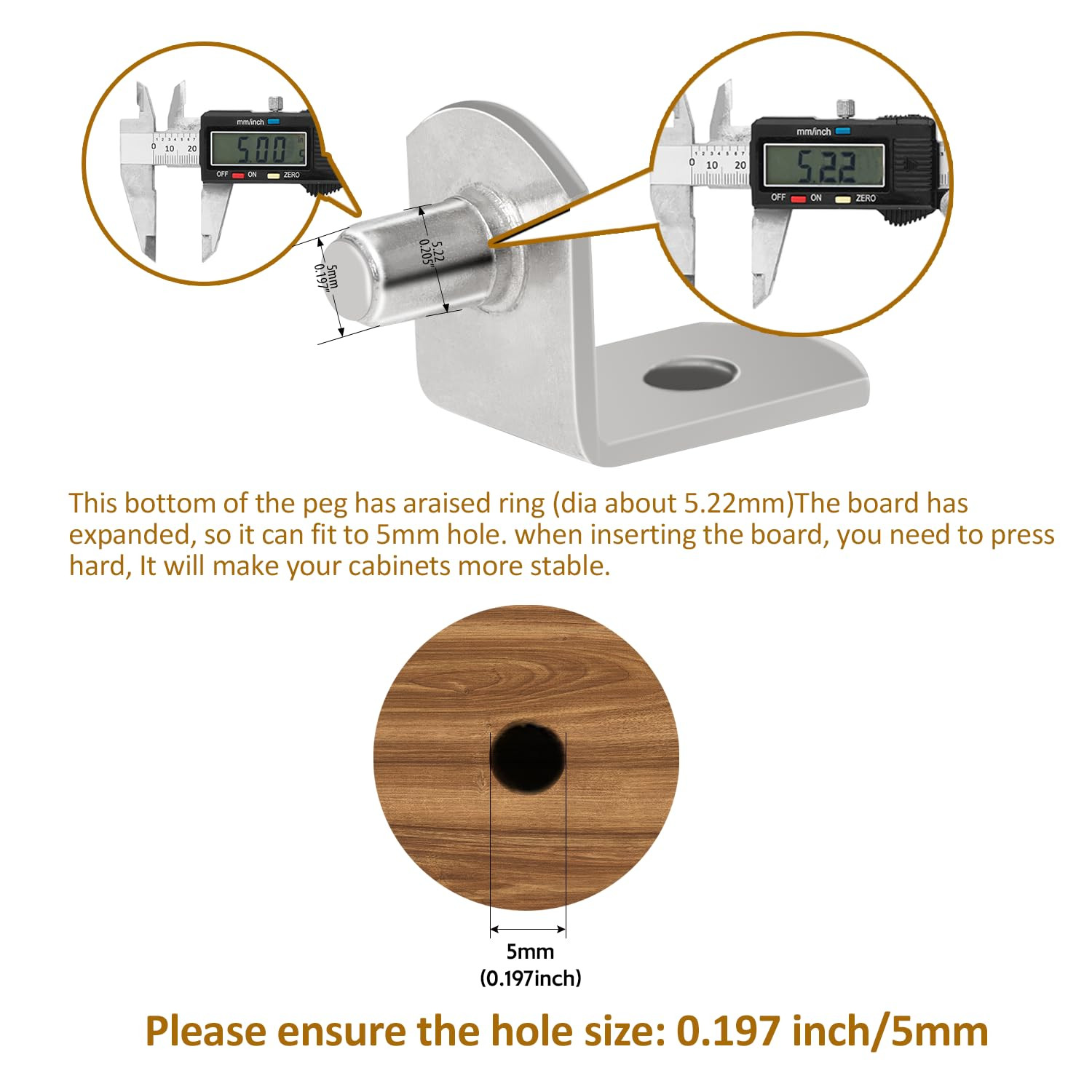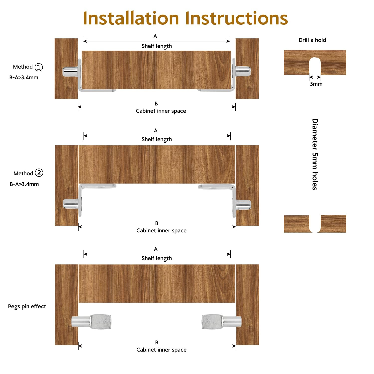 【Shelf Pegs Durable Material】 Pegs for shelves made of high quality zinc alloy and polished nickel, good quality and durable for long using life, surface is smooth without metal burrs, can meet your daily shelving needs. 【Cabinet Shelf Pegs Package included】 Shelf pegs & pins totally included 60Pcs 2 styles nickel plated shelf holder pegs: 30 pcs L-shaped support pins with hole, 30 pcs flat spoon shelf bracket pegs. 【Shelf Support Pegs Size Detail】 Shelf pins fits all cabinets with 1/5 Inch holes. This set include 30 pcs L-shaped shelf bracket pins. L-shaped bracket diameter is 5mm/ 0.2inch, pin length is 8.1mm/ 0.32 inch, and the shelf rest is 19mm/ 0.74 inch in length, 13mm/ 0.5 inch in width. 30 pcs flat spoon shelf holders pegs diameter is 5 mm/0.2inch, Pegs leg length is 9mm/0.35inch, pegs total length: 19mm/0.75inch. (Tip: just make sure that you have the exact shelf hole measurement before you order). 【Shelf Pins Application]】 Shelf support pins fits all cabinets with 5mm (1/5 inch) holes, the shelf support pegs used on bookcase, kitchen, closet, shelf cabinet, closet, furniture, display cabinet, shelves supplies, wine cabinet, solid wood plywood plastic, bookshelf, shoe cabinet, glass plate etc. 【Warm Notice】In order to make cabinet shelf pins a tight fit, your hole should be equal to or slightly smaller than the diameter shown. (less than or equal to 5mm/0.2inch) - Note: Small cabinet shelf pegs, Please keep these small parts away from child).