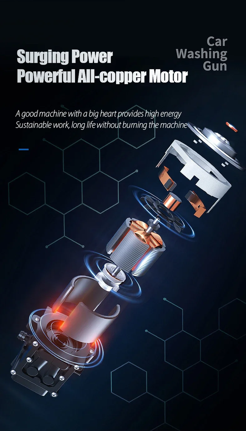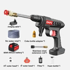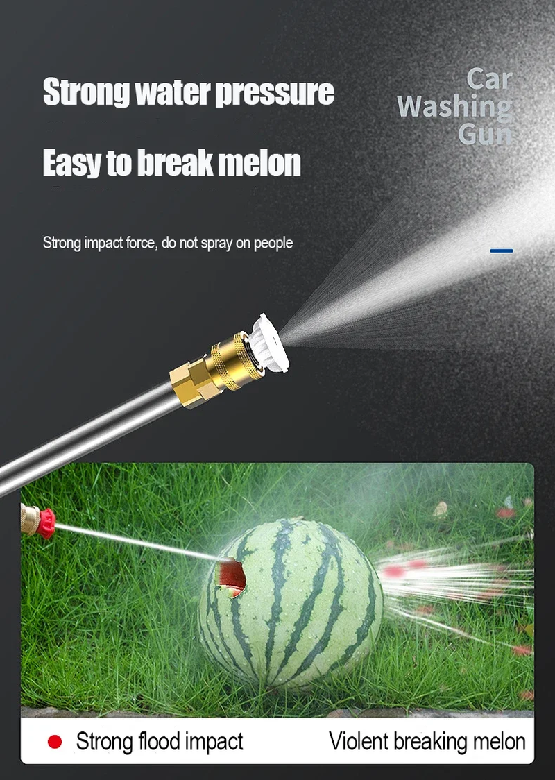 Specification : Battery capacity: 80Wh Product name: Wireless car washing machine Material: ABS and copper Power Supply:Lithium battery Product pressure: 60Bar Drive: Lithium battery wireless drive Maximum flow: 10L/min Jet stroke: 6-10 meters Water pipe length: 5 meters Car washing equipment type: Household Car Washing Machine Water source type: Bucket / Coke bottle / Faucet Self-priming Scope of application: Car washing, watering flowers, watering vegetables, spraying, garden cleaning, etc. Features : 1. Special material waterproof, water and electricity isolation is safer 2. Self-priming/faucet 2 water inlet methods, more convenient to take water 3. 2 Water types adjustable 4.With temperature protection function, automatic shutdown of over temperature and overload, eliminating safety hazards 5.Large amount of water, easy to absorb water 6. A variety of high-quality extension accessories, cleaning is more convenient and clean 7. Multifunctional high-pressure cleaning, very suitable for car washing, garden watering, agricultural irrigation and daily cleaning 8. Simple installation, quick plug-in installation of all interfaces Package included: 1x Washing Machine 1x Lithium battery 1x Charging Cable(For US the cable will be us plug) 1x 5m Water pipe 1x 0° Outlet head 1x 40° Outlet head 1x Quick connector 1x Extension rod 1x Filter 1x Foam pot Question & Answer: 1 No water after startup? A. Machine may entered air: please connect the faucet, running water will discharge the air, then used normally B. Press button more than 15 seconds. let the water inhale the gun body 2 Low water pressure after starting? A. Hose bend: straighten the hose B. Connector is loose: press water connector directly, twice to hear a click C. Dead battery: please charge 3 The machine does not start A. Dead battery: please charge B. Battery immersion: shake the battery upside down a few times C. Inserts loose: corners and middle of the battery circuit board to pressed tightly 4 Foam bottle can't spray? Need to wait for the water to drain before spraying the cleaning agent 5 Scan the QR code to see problem ideo: If you encounter any questions that you don't understand, please contact customer service to handle it for you! grateful! Warm Tips: 1.After the car wash machine is used, it should run empty for a few seconds to drain the residual water in the machine, avoid oxidizing dirt and freezing for weather reasons, and store it in a dry and cool place. 2.Do not store in the trunk of the car in hot weather to avoid fire caused by high temperature. 3.Batteries need to be kept away from water.Remove the battery after use, so as not to affect battery life. High Strength Water Pressure Wireless lithium battery car washing machine Strong pressure / Higher power / Compact and convenient Long life / Fast charging / Simple operation One Hand Operation Compact And Portable The center of gravity of the machine coincides with the position of the palm and tiger mouth According to the lever principle, the shorter the force arm The smaller the effect, the less effort 01. Simple installation 02. Easy to operate 03. Express car wash Fast Selfpriming You Can Wash Your Car Anywhere With Water Wash the car wherever there is water Portable and self-priming , faster and stronger 1.Bucket Self Absorption 2.Faucet Use 3.Coke Bottle Self-priming Cleaning Artifact Multi-purpose Machine Versatile beyond the car wash It can also meet the cleaning needs of various other scenarios Home Yard Flushing / Outdoor portable wash Crop spraying / Spray watering strong water pressure Break the melon easily Strong impact force, do not spray on people Strong flood impact -- Violent breaking melon Strong water output -- Cleaning mud Surging Power Powerful All-copper Motor A good machine with a big heart provides high energy Sustainable work, long life without burning the machine Lithium battery power supply Long endurance Fast charging Separate lithium battery, fast charging No need to wait for car washing, improve safety performance, and supply electricity 0° high pressure direct: Strong decontamination - Washing tires / fenders 40° fan jet: Large area flushing-flushing mud and watering PRODUCT PARAMEERS Water qun nozzle Metal extension rod Vents Water inlet Start trigger Car wash handle Lithium battery Specification : Battery capacity: 40Wh Product name: Wireless car washing machine Material: ABS and copper Power Supply:Lithium battery Power:500W Voltage:21V Product pressure: 60Bar Drive: Lithium battery wireless drive Maximum flow: 10L/min Jet stroke: 6-10 meters Water pipe length: 5 meters Car washing equipment type: Household Car Washing Machine Water source type: Bucket / Coke bottle / Faucet Self-priming Scope of application: Car washing, watering flowers, watering vegetables, spraying, garden cleaning, etc. Package included: 1x Washing Machine 1x Lithium battery 1x Charging Cable(For US the cable will be us plug) 1x 5m Water pipe 1x 0° Outlet head 1x 40° Outlet head 1x Quick connector 1x Extension rod 1x Filter 1x Foam pot