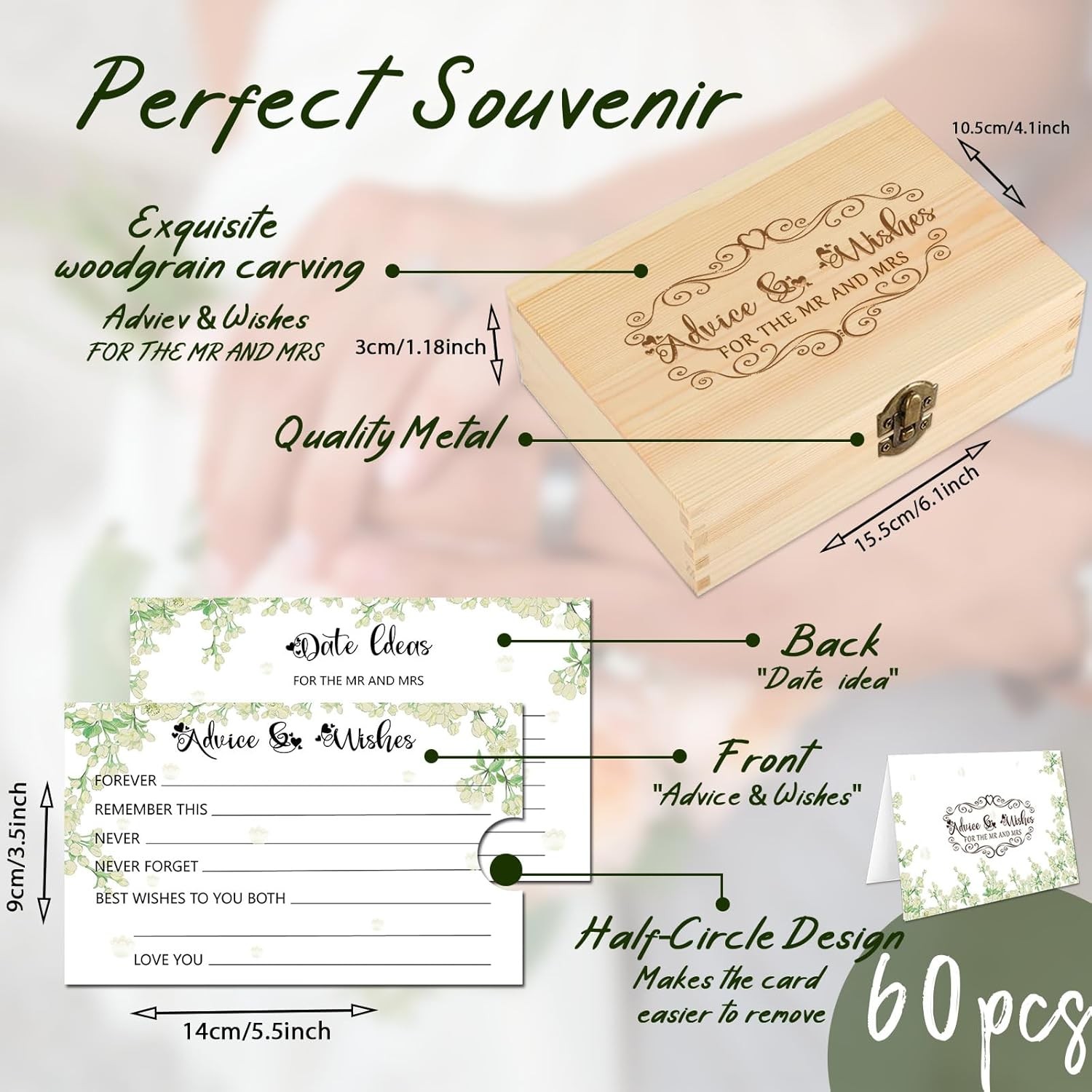 60pcs Advice and Wishes for the Mr Mrs, Wedding 14x9cm/5.5x3.5inch, green Product Details Manufacturer: 1DFAUL Brand: 1DFAUL Item Weight: 8.8 ounces Product Dimensions: 6.22 x 4.53 x 1.3 inches Item model number: YX-USJJ-0464 Color: green Number of Items: 60 Size: 14x9cm/5.5x3.5inch Manufacturer Part Number: YX-USJJ-0464 Wedding Guest Advice Cards For The Bride - The couples will love receivingwell wishes for the mr and mrs and mrs from friends and family. Let your guests write down their wishes and suggestions for the newlyweds and give them something fun to start their married life with a laugh Fun Date Idea Cards - The perfect wedding shower activity for the bride and groom, lovely couples ideas cards add some fun and variety, guests will love filling in this fun date suggestion and the newlyweds can have a romantic date about it. Easy and not lacking in creativity Bridal Shower Guest Book Alternative - The advice cards for bride and groom great for use as a bridal party or bachelorette party game, entice your guests with this special wedding idea card. With a wedding wishes and suggestions guest book on the reception table, your guests will fully enjoy the party and allow your guests to share their joy on your big day Meaningful & Unique Keepsake - treasure your guests' written marriage wishes and suggestions in this wooden wedding card box or date idea box, which will hold all your marriage wishes and suggestions. The unique half-circle design around the edge of the card allows you to remove the memories more easily and will bring a smile to your face every time you remember Perfect Set - This wedding advices and wishes cards set includes 1 wooden box 15.5x3.2x3.2cm/6.1x1.2x1.2inch, 60 cards 14x9cm/5.5x3.5inch with wishes and advice on the front and date idea on the back. As well as a greeting card to write on as many times as you like. NOTE:you can write with a ballpoint pen or pen on the card. After you finish writing, it is recommended to wait until the ink is dry before moving the card. Otherwise, the text on the card will be smeared