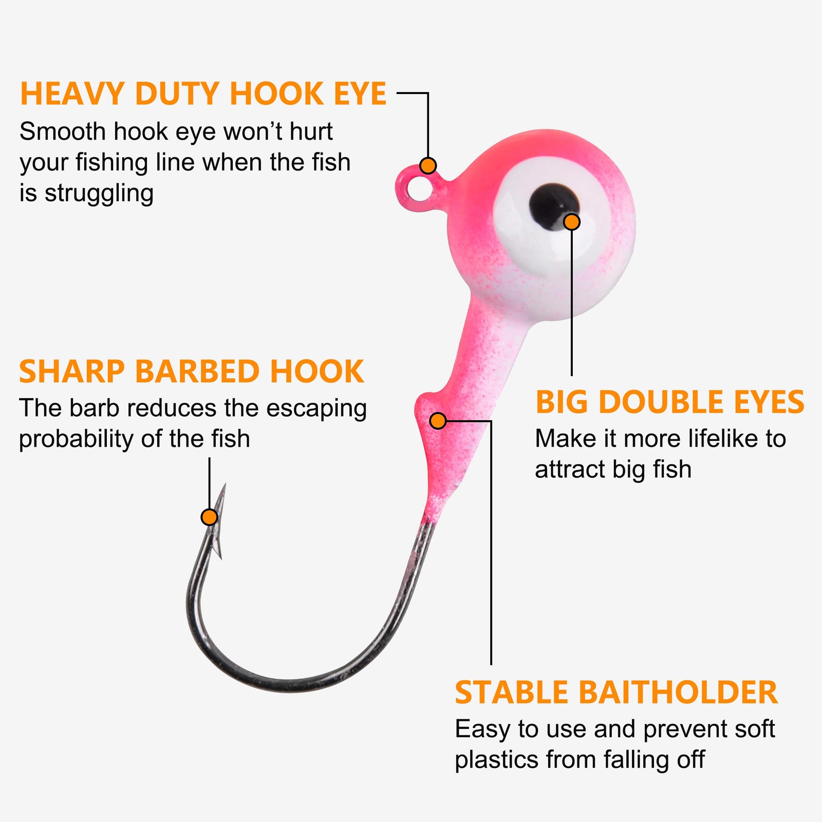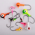What You Get : 60pcs Fishing Jig Hooks. Free Gift: 1pcs plastic fishing tackle box. Details : (Random mixed colors) 0.9g(1/32oz)-20pcs 1.8g(1/16)oz-20pcs 3.6g(1/8oz)-10pcs 7.2g(1/4oz)-5pcs 10.5g(3/8oz)-5pcs Features : 1) Attractive: Round head Lifelike eyes design Vibrant color powder-coated paint finish The fishing jig head hook has excellent appeal. 2) Premium Material: Hook: high carbon steel. Super sharp and has high tensile strength and good corrosion resistance. Not easy to fade. Not easy to rust. Head: Premium electrolytic lead. Whether the head or hook, we use the best materials and craftsmanship. 3) Classic The fishing lures jig heads is a excellent kit for fishing enthusiasts. Is suitable for: Bass, Snakehead, Mandarin fish, Catfish, Blackcarp, Topmouth culter, Makou fish, Wildcarp, Trout, Salmon, Redfish, Yellow check charp, etc,. Prepare fishing jig head hooks for the upcoming winter fishing trip now! 【COLORFUL JIG HEADS】Bright and colorful coating with lifelike eyes, which is easier to attract the attention and attack of fish, greatly improving hook-up rate 【HIGH QUALITY】Sharp high carbon steel fishing hooks won't break and corrosion resistant, pierce the fish easily. The jig head hooks are great for both freshwater and saltwater fishing 【EASY TO INSTALL】These fishing jigs come with barb and bait holder. You can easily install the bait and securely hold it in the right position to minimize bait loss 【JIG HEADS ASSORTMENT】5 Sizes for you to choose form: 1/32oz-20pcs, 1/16oz-20pcs, 1/8oz-10pcs, 1/4oz-5pcs, 3/8oz-5pcs. Includes at least 5 mixed colors. Great for different fishing situations 【APPLICATION】Our round ball fishing jigs heads are idea for fishing crappie, walleye, bluegill, trout, bass, perch, pike, northern, muskie. etc. A great fishing gift to fishing lovers and beginners!