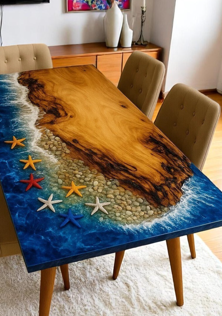 Absolutely stunning centerpiece! The craftsmanship is incredible and it arrived exactly as described. Love how the wood grain flows with the resin, creating a unique art piece that gets constant compliments. Perfect size for our space and incredibly sturdy.