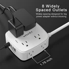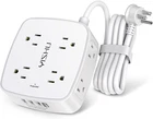 Product Description 6 Ft Surge Protector Power Strip with 8 Widely Outlets and 4 USB Ports Specifications: Input Voltage: 100-240VAC; 60HZ Max.Current: 10A Max.Power Rating: 1250W USB Port Output: DC 5V, Total 4.2A Cord Length: 6 Ft Surge Protection Rating: 600 Joules 8 AC Outlet Extender 3 USB A & 1 USB C Smart Charging Ports 1.78 inches Wide Space AC Outlet 6/10 Ft extension cord with Flat Plug and Cable Ties Surge Protection LED Indicator Item Dimensions: 4.33*4.05*1.65 inches 【8 outlets with 4 USB Ports】- The 3-side power strip with 8AC widely outlets and 4 USB charging ports total 4.2A, each USB A port features 5V/2.4A Max output. USB C charging port features 5V/3A MAX. can power up to 12 devices simultaneously.Wide range voltage design, can be used on 120v to 240v circuit 【Surge Protector Power Strip with 3 Side Design & Wide Space】- 3-side design that makes it easier to make the plugs not covering any outlet, and the 8 AC outlets with 1.8 inches long space in between, larger than standard 1.5-inch socket. 【Multi Safety Protection】- RoHS, FCC and ETL Certificates. This power strip has overload protection, short-circuit protection, over current protection, over-voltage protection and overheating protection. The minimum energy-absorbing capacity of 600 Joules. It will automatically cut power to protect connected devices when voltage surge is overwhelming. 【6 Ft extension cord with Flat Plug and Cable Ties】- 6 Feet Right Angled Flat Plug power cord makes it more flexible ,Reusable Fastening Cable Ties Can tie up the unused cord and make it better organized. he two mounting holes on back allows this power strip to be securely installed in various applications