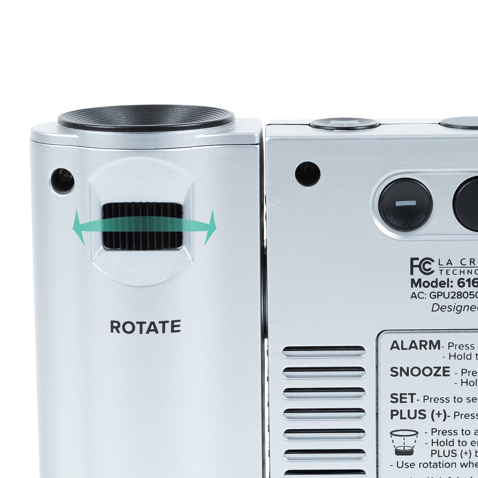 Projects time, indoor, outdoor temperature, or alternate all on the wall or ceiling; Projection brightness control and 270° arm rotation for proper viewing Atomic time and date (manual set option); Automatically updates for Daylight Saving Time (AUTO/ON/OFF option); 7 Time zones: AST, EST, CST, MST, PST, AKT, HAT 1" time digits; 12/24 Hour mode with 10 minute snooze alarm; Adjustable white backlight (4 levels, plus OFF) with auto dim Monitors Indoor and Wireless Outdoor temperature (°F/°C) with trend arrows; Customized calendar: full weekday, day/month/date, alarm time Clock: Requires 5.0V power adapter (optional) 3 AAA Alkaline batteries (not included) for power loss; TX141-Bv3 Wireless Temperature Sensor: 2 AA batteries (not included)