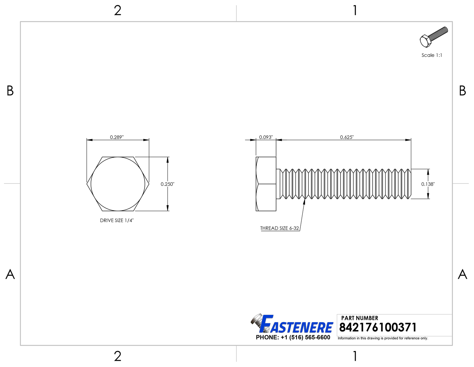 6-32 x 5/8" Stainless Steel Bolts Hex Head Grade 18-8 Qty 2500 Hex Tap Bolts, also known as fully-threaded Hex Cap Screws. These bolts have a variety of uses for construction, agriculture and automotive applications. General Product Information Head Style : Hex Drive Style : Socket Drive Size : 1/4" Thread : 6-32 Length : 5/8" Material : Stainless Steel 18-8 Quantity of Hex Bolts in Package : 2500 Detailed Product Information: Hex Head Width Flat to Flat : 1/4" Head Height : 3/32" Thread Diameter : 0.138" Threads Per Inch (TPI) : 32 Coarse or Fine Thread : Coarse Thread Coverage : Full Thread Thread Length : 0.625 Key Notes: Hex bolt made from high quality stainless steel grade 18-8 which offers one of the highest levels of corrosion and chemical resistance and will out last all other standard and plated fasteners available Stainless steel hex bolts are the most common construction fastener having a hex head that can be secured with a socket or wrench and mated with a nut or other internally threaded item with a machine thread pattern of 10-24 Hex bolts also reffered to as tap bolts are fully threaded with a 1/2 inch of thread length that is measured starting from underneath the head to the end of the thread Fastenere brand Stainless steel bolts have a high tensile strength of 70,000 PSI and meet ASMEB14.2.1 specifications for bolts that you can trust to stand strong under presure and secure your projects for years to come with no requirement for costly maintenance Fastenere ultra stainless hex bolts are guaranteed to out live and out last all other grades of hardware when exposed to outdoor elements Shipping: All orders placed before 3:30 pm EST Will Ship Same Day Tracking is provided on ALL Orders Priority Mail Shipping service is offered at a discount of only $3.95 UPS Ground UPS Next Day Air is available, Please inquire for pricing Returns : ALL returns are accepted if returned within 60 days. Money Back or exchange guaranteed. NO Restocking Fees. For YOU, we constantly strive to find ways of improving our performance.