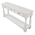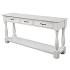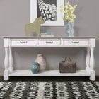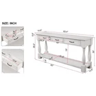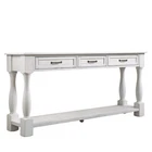 63inch Long Wood Console Table with 3 Drawers and 1 Bottom Shelf for Entryway Hallway Easy Assembly Extra-thick Sofa Table Product Features [SOLID WOOD FRAME and LEGS] Solid wood frame and legs, max weight capacity of top:220lbs, durable and sturdy use for years, solid wood frame and legs also make the console table look more valuable. Solid wood and extra-thick legs makes the wood console table more stable. The support leg under the bottom shelf makes the console table more stable [Sufficient Load-Bearing Capacity]: 63''L x 14.56''W x 30''H. Weight -61.73lbs. Top weight capacity - 220lbs, shelf weight capacity - 66lbs, each drawer - 17lbs. [Easy and Fast to Install]- Including all necessary tools and clear instructions, and pieces were labeled perfectly, so you can easy and fast to assemble this sofa console table. Only need to install the four legs and bottom shelf. [American Design & Mid-Century Style]: This style is a perfect fusion of retro and modern. The whole table and metal handle are both aim to bring mid-century atmosphere to your home. [Multi Functional Storage Space] The sofa table features with total 3 functional drawers and a fixed lower shelf and long enough tabletop which provide enough storage space. This is a good place to put your daily necessities. Description Product Overview: Partial Assembly Required // Environmentally Preferred // Extra-thick Legs // Solid Wood // Console Table Drawers and Bottom Shelf Three Drawers and one bottom shelf are for storing daily necessities or files and so on to ensure your home clean and tidy Solid Wood Frame and Legs solid wood leg guarantee the stability and durability and high quality tabletop ensures the smooth touch feeling. Mid-Century Style the whole console table and all details including handle and finish are aim to bring mid-century style to your home. Sufficient Load-Bearing Capacity Tabletop can bear max 220lbs; each drawer bears max 17lbs; Open shelf can bear max 66lbs Dimensions & Weight: Product Dimensions & Weight 63.38''x14.56''x30''; 61.73LB Package Dimensions & Weight 66.93''x17.32''x13.19''; 70.55LB Drawer Internal Dimension 13.6"L x 9.7"W x 2.8"H Weight Capacity Tabletop: 220 LBS Bottom Shelf: 66 LBS Single Drawer: 17 LBS Specifications: Product Name Console Table Material Legs: solid pine wood; Bottom shelf: solid wood(outer frame)+MDF(middle); tabletop: solid wood(outer frame)+ MDF(middle); drawers: solid wood(outer frame)+MDF Finish Painting Finished Back No Assembly Required 20min Additional Tools Required All tools included Pieces Included One Package Number 1 Care & Maintance 1.Wipe with a soft dry cloth. Avoid the use of harsh chemicals and household cleaners as they may damage the finish. 2.Hardware may loosen over time; periodically check that all connections are tight. Notice 1.Real Product's Color may be a little different from the image due to the lighting or monitor's display. 2.Manual measurement has been used, there may be some reasonable error.