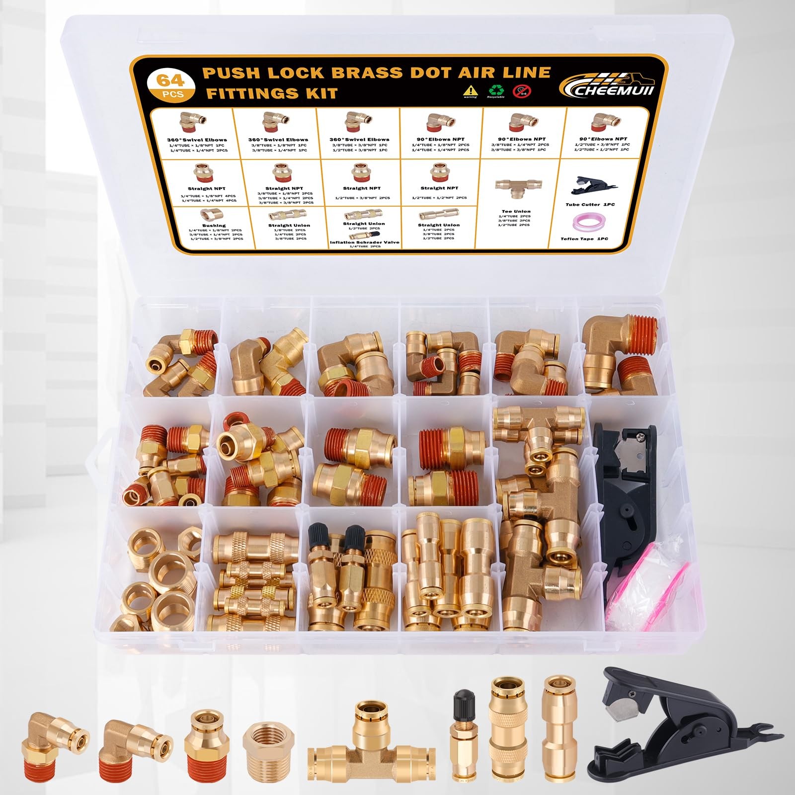 64 Pcs Brass DOT Air Line Fittings Kit Push Lock & Quick Connect Fittings NPT Th 64 PCS PACKAGE: The 64 pcs DOT air line fittings assortment includes: 6 pcs brass tube tee fittings, 14 pcs brass straight union connectors, 18 pcs brass straight push & NPT thread, 9 pcs 90°elbows NPT thread, 7 pcs 360° swivel elbows NPT thread, 6 pcs brass bushings, 2 pcs brass 1/4" inflation Schrader valve, 1 pc tube cutter, 1 pc Teflon tape. Air brake line fittings types: 1/8", 1/4", 3/8", 1/2" PREMIUM DOT FITTINGS: CheeMuii DOT air hose fittings are made of CA360 pure brass, meet D.O.T. FMVSS 571.106 approved, SAE J1131 air brake system requirements, with corrosion resistance, high-temperature ductility, low permeability and long service life AIR SUSPENSION VALVE: CheeMuii 1/4" inflation Schrader valves are made of CA360 pure brass, which is durable and corrosion-resistant. Thread length: 3/4". Provide a manual inflation point to air spring suspension bags. Each expansion valve is equipped with a protective cap to prevent dirt and mud MAX WORKING INTENSITY: The brass fittings can be operated in pressures from vacuum to 800 PSI and in temperatures from -40°F to +248°F (-40°C to +120°C). Note: see the tubing manufacturer's recommendations for pressure and temperature mutations EASY INSTALLATION: The quick connect design and precise NPT threading make installation of air brake accessories easy, just push to connect. And there is pre-applied sealant on NPT male thread for better sealing WIDE APPLICATION: The brass DOT air fittings can be used for air suspension systems, perfect for semi truck/trailer/RV repair air line leak, also ideal for industrial workshops, daily garden or lawn mower repair, towing machine hose connection, etc CheeMuii 64 Pcs Brass DOT Air Line Fittings Kit Push Lock DOT Air Fittings Push to Connect Fittings NPT Thread & Quick Connect Air Hose Fittings for Air Line Air Hose Pneumatic Tubing 【64 PCS PACKAGE】- The 64 pcs DOT air line fittings assortment includes: 6 pcs brass tube tee fittings, 14 pcs brass straight union connectors, 18 pcs brass straight push & NPT thread, 9 pcs 90°elbows NPT thread, 7 pcs 360° swivel elbows NPT thread, 6 pcs brass bushings, 2 pcs brass 1/4" inflation Schrader valve, 1 pc tube cutter, 1 pc Teflon tape. Air brake line fittings types: 1/8", 1/4", 3/8", 1/2" 【PREMIUM DOT FITTINGS】- CheeMuii DOT air hose fittings are made of CA360 pure brass, meet D.O.T. FMVSS 571.106 approved, SAE J1131 air brake system requirements, with corrosion resistance, high-temperature ductility, low permeability and long service life 【MAX WORKING INTENSITY】- The brass fittings can be operated in pressures from vacuum to 800 PSI and in temperatures from -40°F to +248°F (-40°C to +120°C). Note: see the tubing manufacturer's recommendations for pressure and temperature mutations 【WIDE APPLICATION】- The brass DOT air fittings can be used for air suspension systems, perfect for semi truck/trailer/RV repair air line leak, also ideal for industrial workshops, daily garden or lawn mower repair, towing machine hose connection, etc Shipping We offer FREE shipping on all orders! We ship within Three business days of payment, usually sooner. We use a selection of shipping services such as UPS, FedEx, USPS etc. We only ship to the lower 48 states, no APO/FPO addresses or PO Boxes allowed. Local pickups and combined shipping options are not provided at this time. Return You can return a product for up to 30 days from the date you purchased it. Any product you return must be in the same condition you received it and in the original packaging. Please keep the receipt. Payment We accept payment by any of the following methods: PayPal Please pay as soon as possible after winning an auction, as that will allow us to post your item to you sooner! Feedback Customer satisfaction is very important to us. If you have any problem with your order, please contact us and we will do our best to make you satisfied. Contact Us If you have any queries, please contact us via ebay. We usually respond within 24 hours on weekdays. Please visit our eBay store to check out other items for sale! Thank you for shopping at our store.