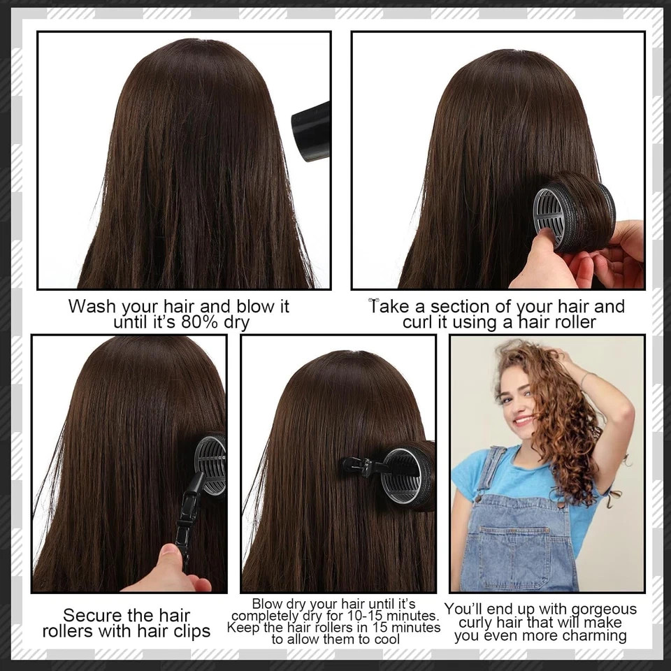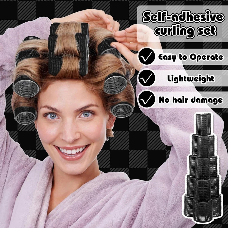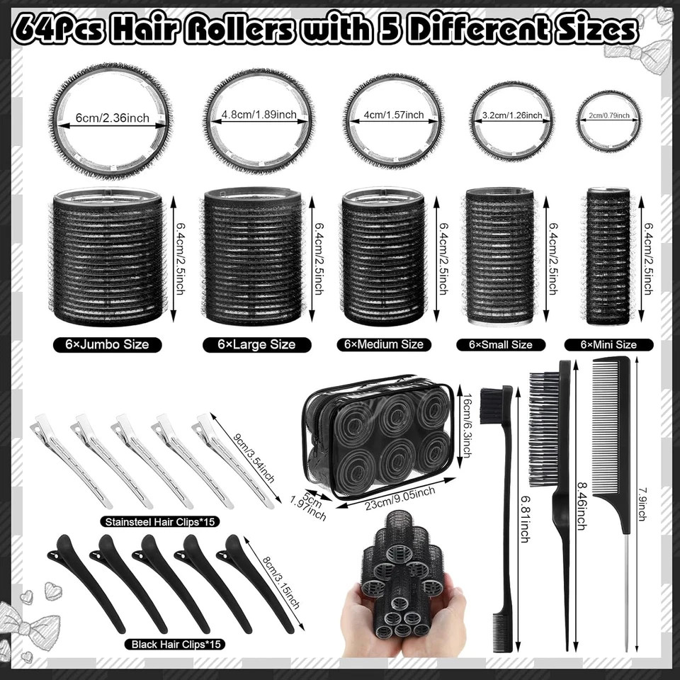 About this item 【Sufficient Quantity】The black self grip hair rollers set includes 30 black hair rollers (5 sizes), 15 metal duckbill clips, 15 black duckbill clips, 1 edge brush, 1 rat tail comb, 1 bristle brush and a storage bag. Complete accessories make it easy for you to create beautiful curly hair styles 【5 Sizes Hair Curlers】Jumbo 2.36 inches, large 1.89 inches, medium 1.57 inches, small 1.26 inches, extra small 1 inch, 6 of each size. Rollers hair curlers of various sizes can create different curls and volume. For example, big wavy curls, retro curls, wool curls, air bangs, etc. 【Heatless Hair Curler】Our black hair rollers for women is a physical curling tool that can be used without heating or adding chemical additives. It can reduce hair dryness, hair loss or tangling caused by perming. Note: It is not recommended to use on thin or very hard hair 【How to use】Take an appropriate amount of slightly damp hair, wrap the ends of the hair around the hair rollers and slowly roll it up, and fix it with a clip. Wait for about 30 minutes to dry, or use a hair dryer to blow dry quickly. Finally, slowly remove the curler along the direction of the hair bend 【Wide Use】The hair rollers set includes a cosmetic bag storage bag, which is convenient to carry and use. It is also a great present for family, friends or hairdressing enthusiasts. You can wear it while cooking and putting on makeup, which saves time and effort, and can instantly improve your appearance in a short time