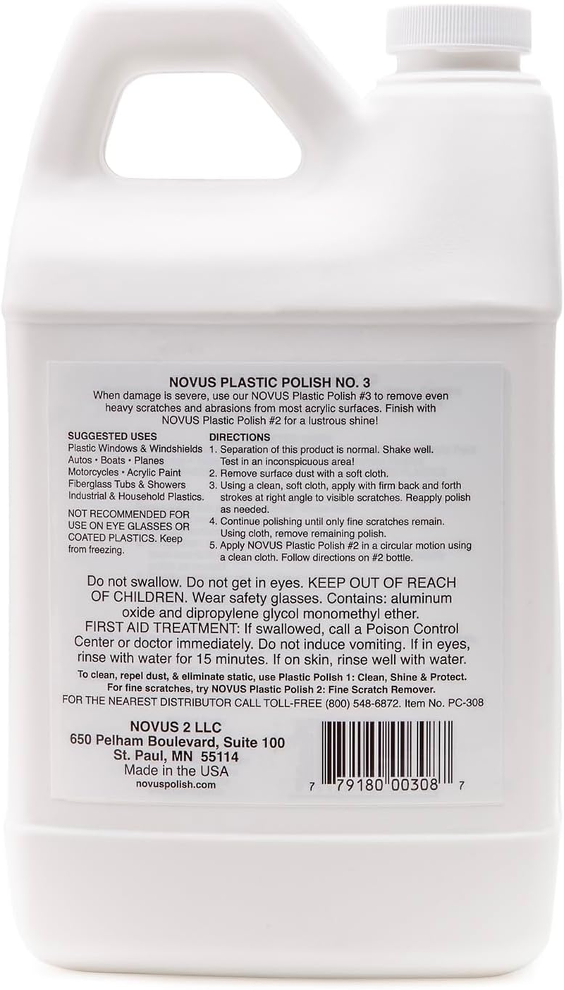 High quality scratch remover for heavy scratches! Prepares acrylic surfaces for NOVUS Plastic Polish #2 Great for restoring weather damaged plastics, auto headlamps, boats, aquariums, windshields, helmet shields, goggles etc.; significantly reduces haziness For use on acrylic and most plastic surfaces; use when damage is too severe to be restored with NOVUS Plastic Polish #2 These Polish Mates wipers are highly absorbent, abrasion resistant, low-lint, and extra durable. Cloth-like softness in a disposable wiper 12" x 12" approximate size BUNDLE INCLUDES: Polish Mates pack of 6 disposable wipers, and one 64-ounce bottle of Novus #3 Heavy Scratch Remover Novus Plastic Polish | Heavy Scratch Remover #3 NOVUS 7081 Heavy Scratch Remover is the perfect solution for when damage is too severe to be restored with any other polish. This cleaner/polish will make your scratched acrylics take on new life. Removes heavy scratches and abrasions from most acrylic surfaces. Use when damage is too severe to be restored with NOVUS # 2 polish. Requires use of NOVUS # 2 for final finishing. Not recommended for use on coated plastics. Comparing Novus #2 and #3 Polishes NOVUS #2 removes fine scratches, haziness and lighter imperfections in Lucite and Plexiglas. NOVUS #3 removes heavy scratches and abrasions from most acrylic surfaces. Both polishes contain a light abrasive and are not for use on eyeglasses, polycarbonates or coated plastics. NOVUS #2 should be used as a follow up to NOVUS #3 for best results. Take the heavy scratches out of your acrylic with Novus Plastic Polish #3 Heavy Scratch Remover. Instructions: 1) Shake well. Test in an inconspicuous area. 2) Apply NOVUS #3 Heavy Scratch Remover liberally. Using clean, soft cloth, polish with a firm back-and-forth motion at right angles to the scratches. Keep the cloth saturated with polish at all times. 3) Continue polishing until only fine scratches remain. Using cloth, remove all remaining polish, this is very important! 4) Using a clean cloth, apply NOVUS #2 in a circular motion uniformly to entire surface. Polish using light pressure until NOVUS #2 dries to a light haze. 5) Using a clean portion of the cloth, buff the surface clean. Follow with NOVUS #1 for best results.