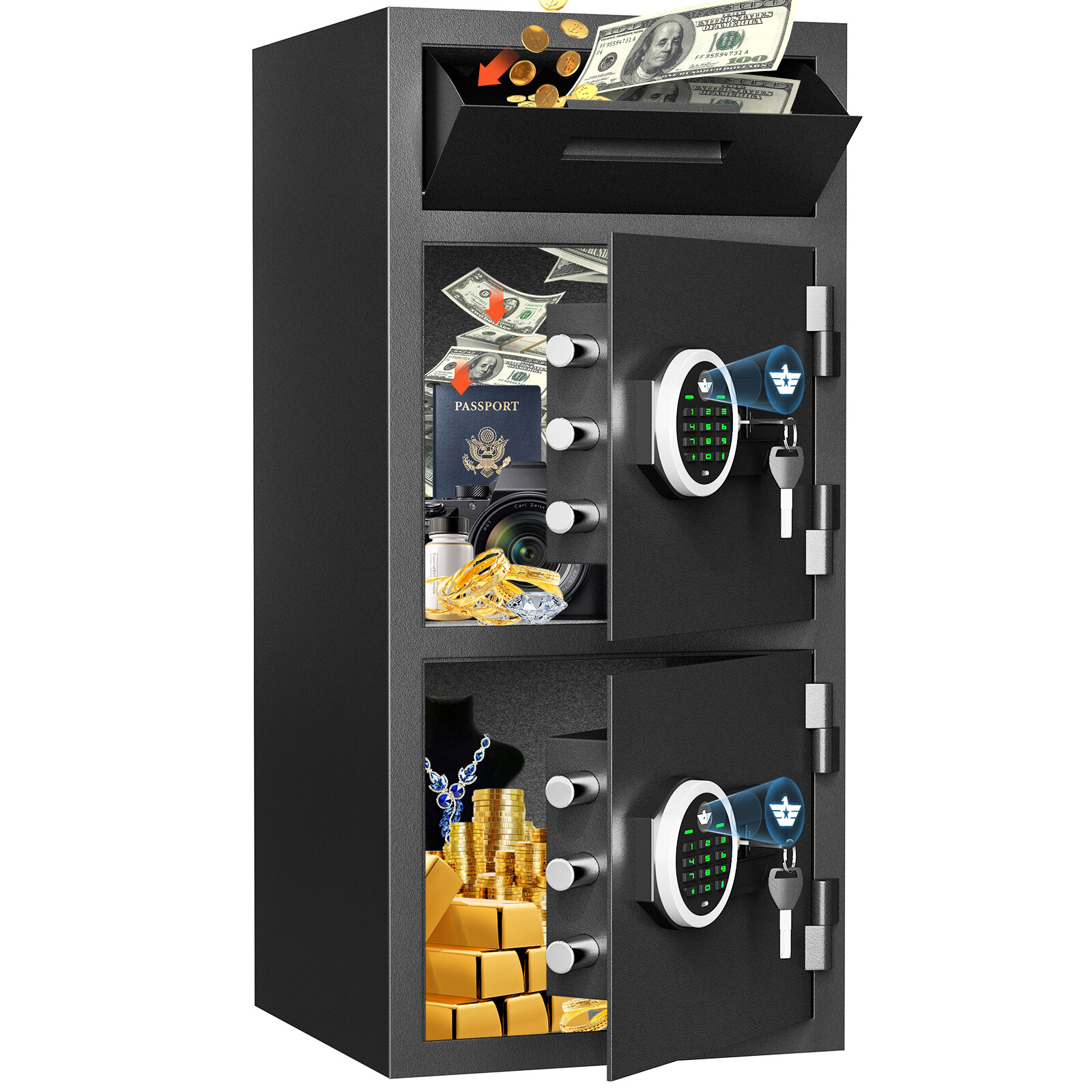 【Extra Large 6.5 Cub Security Safe Box】 The external size is 13.78"D x 13.78"W x 29.53"H. 2024 new upgraded double door design, which can open and operate separately. Kavey large safe box can meet the storage needs of your whole family, which can hold almost any valuables, like trophy, laptop, pistols, documents, cash, jewelry and more. Besides, we also add soft lining in the inner space, which can better protect your valuables from scratching. 【Anti-theft Heavy Duty Safe】 Made of reinforced low carbon alloy steel, pry-resistant thicken door, plus 6 solid living bolts, all make our safes for home tamper-proof and prevents forced entry, thus can better protect your valuables. Kavey safe box fireproof waterproof puts your security concerns to rest once and for all. 【Anti-fishing Design Drop Slot】 Our drop safe box with drop slot, which makes easy and quick to drop your daily things like coins, money or other small items without opening the door, which can be widely used many places like home, hotel, motels, bank counter, cab, café, restaurants, office, retail businesses, etc. In addition, Anti-fishing design provides protection against theft and burglaries for cash, receipts, deposit slips, keys, and other valuables. 【Dual Alarm System】 Kavey home safe has a dual alarm system which activates after 3 consecutive incorrect passwords or violent vibrations, with a 70 decibel alarm sound lasting 60 seconds, audible throughout your home, enough to deter even the most audacious intruders. The alarm can be stopped by entering the correct password. 【Backlit Keypad, Built-in LED Light & Mute Function】 Backlit keypad can let you easily see and operate the password clearly even in the dark; When you open the safe with password, the led light will on automatically, you can quickly find what you want. Mute function is also necessary for you when you want to open the security safe without making a sound, will not disturb your family or remind intruders. 【What You Get】 1*new 6.5 Cub Kavey drop safe, 4*emergency keys, 6*expansion screws, 1*usb type-c cable, 4*non-slip pads, 1*user manual. Besides, we have a lifetime customer service for each cabinet safe we sold. If you have any questions, you will always enjoy 7*24h friendly customer service from Kavey. 【Floor & Wall Mounted】 Pre-drilled mounting holes with six expansion bolts(four at the back, two at the bottom) are included, you can bolt this fireproof safe to the floor, on the wall, or inside a cabinet, increase the safety factor and prevent theft.