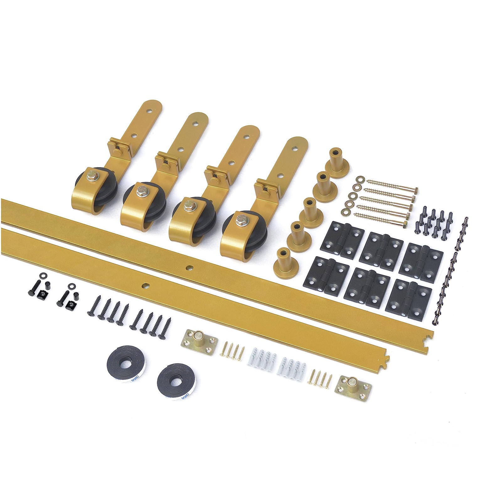 Bifold sliding barn door hardware [Material and Surface Finish]: Crafted from durable carbon steel, ensuring longevity and strength. The surface is treated with a yellow powder coating, enhancing both aesthetics and resistance to wear and corrosion. [Hardware Only]: This set includes hardware components for your door system but does not include the door panel itself. [Comprehensive Set]: The full hardware set includes 2 tracks (each 32-1/2 inches), 4 track and wall connectors, 2 floor guides, 6 hinges, 2 fixed rollers, 2 bifold rollers, and 2 fixed roller lock brackets. [Compatible Dimensions]: Designed to fit door leaf widths up to 15-1/4 inches (total 61 inches) with a thickness ranging from 1-3/8" to 1-5/8". [Sturdy Construction]: The track length measures 65 inches (32-1/2 inches per track) and can support a maximum weight capacity of 198lbs. The track is pre-drilled with holes spaced 16 inches apart, ensuring compatibility with standard US stud wall spacing. [Precise Installation]: The height from the top of the door to the roller is 5 7/8 inches, with a door-to-wall gap of 1 inch to 1 3/16 inches when closed and 1/4 inch to 3/8 inch when opened. Please note: Do not mount the rail directly onto drywall; ensure screws can be securely fixed into studs or solid walls for proper installation.