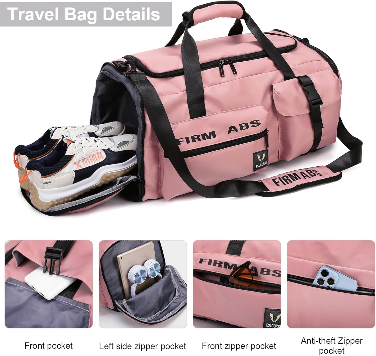 ➤ 65L Extra Large Capacity Duffle Bag: Our Eslcorri travel duffle bag for Women & Men measures 23.6*13.8*11.8in, which can hold a capacity of 65L, enough space for clothing for a 4-6 day trip. It is a perfect weekender bag with a wide opening for easy packing, and also an ideal overnight weekend boarding bag for business or personal travel. Can be folded when not in use. ➤ 3 IN 1 Multipurpose Airplane Friendly Travel Bag: This duffle bag for women and men can be carried in different ways: like a regular duffel bag, like a crossbody bag, or strapped to your back like a giant backpack(hidden straps). Easily held all your gym or travel necessities, a great choice as a large gym bag, travel duffle bag, yoga bag, weekender bag, overnight bag, swimming bag, camping bag, workout bag, or carry-on luggage. ➤ Multiple Pockets Sports Gym Bag: The duffle bag for men has 1 main bag, 1 front zip pocket, 1 utility pocket, 1 separate shoe compartment, 1 side bag, 1 wet zipper pocket, 1 back zipper pocket, 1 back luggage sleeve, and 1 hidden backpack shoulder strap. The trolley sleeve zips closed and double as an additional external pocket when not in use. The over-the-shoulder strap is padded but not super comfortable when the bag is full/heavy. ➤ Independent Shoe Compartment & Wet Pocket: The bottom compartment of the personal item travel bag is spacious and can easily fit 2 pairs of women's shoes, which doesn't interfere with the available space in the main duffle compartment. There is a wet pocket in front, which can store clothes after fitness.* [For any issues or concerns, feel free to via Messenger, so we can help you resolve them.] ➤ Upgraded Material: Our duffle bags are made with premium Fabric, it weighs 2.1 pounds and is lightweight, soft, washable, waterproof, wrinkle-free, wear-resistant & tear-resistant. The waterproof exterior keeps your clothes and items dry. It can hold clothes, a 17-inch Laptop, swimsuits, makeup, towel, water bottles, snack, toys, shoes, etc. Product Description Eslcorri 65L Travel Duffel Tote Bag for Women Men If you are looking for a versatile lightweight, collapsible and double-use carry duffle bag, get this! 3 in 1 Large Sports Gym Bag Multipurpose Weekender Foldable Resistant Duffle Bag Multipurpose Travel Duffel Bag Weekender Carry On Overnight Bag for Airplanes 3 IN 1 Multipurpose Airplane Friendly Travel Bag : This duffel bag for women and men can be carried in different ways: like a regular duffel bag, like a crossbody bag, or strapped to your back like a giant backpack(hidden straps). Easily held all your gym or travel necessities, a great choice as a large gym bag, travel duffle bag, yoga bag, weekender bag, overnight bag, swimming bag, camping bag, workout bag, or carry-on luggage. WATER-RESISTANT Travel Bag Independent Shoe Compartment & Wet Pocket Multiple Pockets: 1*Main Bag 1*Front Zip Pocket 1*Utility Pocket 1*Wet Zipper Pocket 1*Side Bag 1*Back Zipper Pocket 1*Back Luggage Sleeve 1*Separate Shoe Compartment 1*Hidden Backpack Shoulder Strap The bottom compartment of the personal item travel bag is spacious and can easily fit 2 pairs of women's shoes, which doesn't interfere with the available space in the main duffle compartment. There is a wet pocket in front, which can store clothes after fitness. Multiple Pockets Sports Gym Bag 65L Extra Large Capacity Duffel Bag for Swimming Yoga Camping Our Eslcorri travel duffle bag for Women & Men measures 23.6*13.8*11.8in, which can hold a capacity of 65L, enough space for clothing for a 4-6 day trip. It is a perfect weekender bag with a wide opening for easy packing, and also an ideal overnight weekend boarding bag for business or personal travel. Can be folded when not in use. This duffle bag for women men delivers roomy main compartment to store your clothes and items. Womens Mens Sports Gym Bag Carry On Overnight Backpack for Swimming Yoga Camping This gym bag can fit all of your workout things, shower bag, shower/gym shoes, towel, change of clothes etc.. It is a perfect overnight weekend bag has roomy space, ideal for a 4-6 day business or travel like trekking or camping. It fits a lot, clothes, toiletries, shoes, gear and other essentials. Eslcorri 65L Travel Duffel Bag and Crossbody Bag in Different Sizes Add to Cart Add to Cart Add to Cart Add to Cart Customer Reviews 4.6 out of 5 stars 259 4.6 out of 5 stars 259 4.6 out of 5 stars 259 4.5 out of 5 stars 38 4.5 out of 5 stars 38 4.5 out of 5 stars 38 4.5 out of 5 stars 38 Price — — — $19.99 $ 19 . 99 $19.99 $ 19 . 99 $19.99 $ 19 . 99 $19.99 $ 19 . 99 Size-Inch 23.6" x 13.8" x 11.8" 23.6" x 13.8" x 11.8" 23.6" x 13.8" x 11.8" 11" x 9.1" x 3.9 " 11" x 9.1" x 3.9 " 11" x 9.1" x 3.9 " 11" x 9.1" x 3.9 " Material nylon nylon nylon woven straw + PU leather canvas+ PU leather canvas+ PU leather woven straw + PU leather Designed For Swimming Yoga Camping Business Travel Hiking Travel Gym Yoga Shopping, Dating Daily use Working Commuting water proof ✓ ✓ ✓ water resistant water resistant water resistant water resistant Good Gift Choice ✓ ✓ ✓ ✓ ✓ ✓ ✓