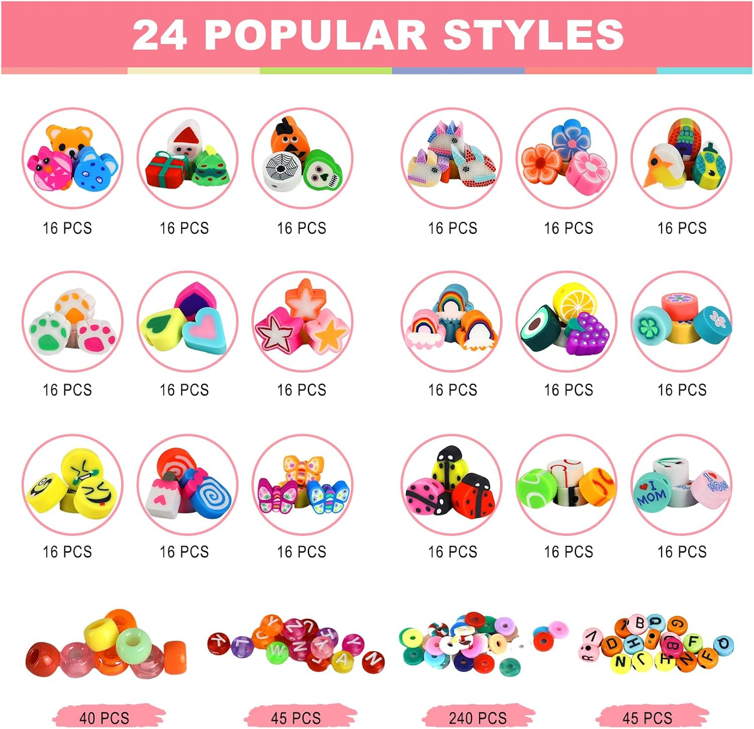 VALUE SET: One box contains 24 styles of polymer clay bead bracelets making kit, including letter beads, pony beads, clay beads, animal, Christmas Halloween, ladybug, flower, love, star, rainbow, fruit, smiley face, candy, butterfly, unicorn, ball beads etc. In addition to a roll of elastic thread, the rich variety provides excellent creativity for your DIY project, satisfying all your handmade desires. Suitable for making jewelry and home decor, unleash your imagination. SUITABLE SIZE: Polymer clay beads are approximately 10mm with a 2mm hole; flat clay beads are approximately 6mm with a 2mm hole; alphabet beads are approximately 4*7mm with a 1mm hole. All beads are stored separately in a 24-compartment plastic box, making them very easy to store and carry. ECO-FRIENDLY MATERIALS: Our beads are made of healthy and environmentally friendly materials that are not easy to fade, comfortable to wear, and of superior quality. Whether you are taking a shower, swimming, or engaging in other water activities, you can wear them with confidence. ENJOY DIY FUN: Clay beads charms are suitable for making bracelets, cell phone charms, necklaces, earrings, eyeglasses chains, key chains, hair braids and so on. Try to use your imagination and explore more uses, you will be impressed by your excellent creativity. NICE GIFT CHOICE: Clay bead bracelet making kit is an ideal gift for your friends, you can also make unique decorations for them, they will love it! Suitable for DIY crafts with kids, cute charms for bracelets can improve their creativity, imagination, color perception, hands-on ability and attention. Product Description Redtwo's polymer clay beads are made from safe materials with great toughness and quality. Ideal for kids and adults who love DIY, whether making bracelets, necklaces, earrings, or other fun projects. This vibrant kit has everything you need to bring your ideas to life! 24 Styles of polymer clay beads offer all the options you need for colorful DIY projects, With 660+ polymer clay beads and accessories, you can create a variety of jewelry and crafts.Made from quality materials, these beads provide flexibility, durability, and safety for your creations.