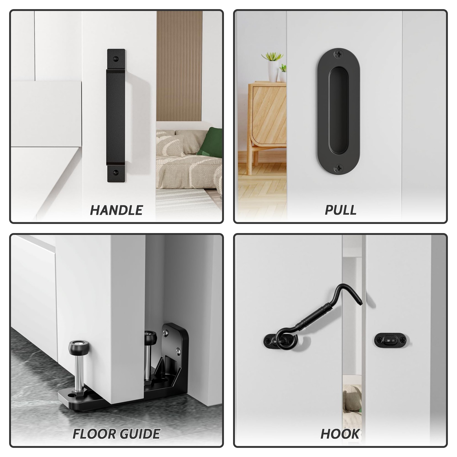barn door hardware kit set including handle pull,hook,wall mounted floor guide. [INNOVATION DESIGN-LIGHT VERSION] By using the light version carbon steel for barn door hardware system(lighter but hold maximum 265lbs, More stronger and stable), The barn door track will be easy to lift up during installation. Low clearance barn door hardware, Less space required, The barn door roller is shorter, Which make the space required from top of barn door to ceiling will be only 5". [PREMIUM RAW MATERIAL] Barn door hardware kit are made of premium quality carbon steel in thickness of 5/32", Which make the barn door kit system more sturdy and stable durability. The wheel part are made of POM(better than steel, few scratch to barn door track), 2 pcs Bearings in side wheel, All these ensure the sliding will be smoothly and quietly. [REASONS FOR CHOOSING US] Get super quality barn door hardware kit from us ,All the barn door hardware kit have been inspected in factory before delivery,Passed 100,000 times opening and closing test.Get barn door hardware kit with a manufacturer price,why not ? In case you got any confustions on installation or missing parts after got the package ,kindly feel free to via directly ,we will get back to you in 24 hours ,thank you . [EASY TO INSTALL] Barn door track pre-drilled hole space is 16", Step by Step Instruction included. Our Instruction is listing every step for installation from A to Z. You can finish the installation of barn door hardware kit in half an hour if you get 2 workers. In case you get any problem or missing parts during installation, please free feel to via . [SPACE SAVING] Sliding barn door hardware kits provide an excellent solution for space utilization. Unlike traditional sliding doors, barn door systems don't impose limitations on the space behind the door, enabling you to conveniently organize items there. The key benefit of opting for a barn door system is the significant enhancement in spatial efficiency, which ultimately contributes to a neater and more organized space.ONLY BARN DOOR HARDWARE KIT INCLUDING ,BARN DOORS ARE NOT INCLUDED.