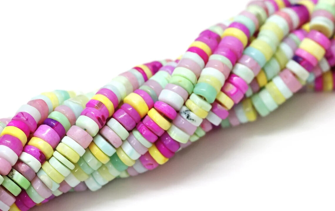 Made by Radhikagemsnbeads Supplies for making crafts Materials: Gemstone Bead hole size: .50 millimetres Beautiful Multi Disco Opal plain smooth Tyre Shape Heishi Beads, 7-9mm Mix Color Opal Plain Wheel shape gemstone Beads, jewelry making craft Gemstone : Opal Beads Color : Multi color Opal Size : 7 mm to 9 mm approx. Shape : tyre shape / Wheel shape Style : Smooth Handmade Beads Quality : AAA For : Necklace, Jewelry Design, Craft Making, Gift,Etc. Length : 8 inch / 16 inch