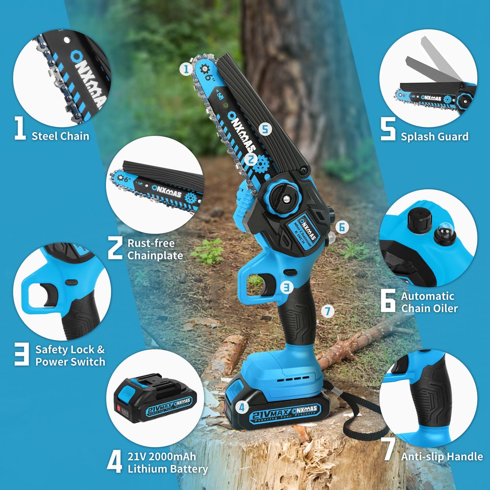 Mini Chainsaw 6 inch Cordless, Wood Ranger Mini Chainsaw with 21V 2.0Ah Battery Smooth Cutting Performance: ONXMAS chainsaws are equipped with high-quality, deep-quenched guide chains and an upgraded copper motor, ensuring smooth, efficient, and long-lasting cutting Easy and Convenient Operation: The chainsaw features a push-button oil spray system, and the safety switch is designed for easy use with both hands. The chain can be adjusted tool-free, ensuring smoother branch pruning Lightweight for Easy Handling: At just 3.2 lbs (with battery), this cordless chainsaw is designed for easy one-handed operation, making it manageable for women and reducing fatigue during extended use Enhanced Battery Longevity:This mini chainsaw comes equipped with a 21V removable, rechargeable 2000mAh battery, providing extended performance. You can conveniently recharge the batteries whenever needed, ensuring that your chainsaw is always ready to go Enhanced Safety Mechanisms: To operate the mini chainsaw, engage both the safety lock and switch simultaneously. This dual safety system prevents accidental start-ups, keeping you and your family secure Perfect Gift Idea:This blue and black gardening tool is an ideal gift for carpenters and gardeners. Its sleek design makes it a great choice for Father’s Day, Christmas, Birthday, Anniversary, Thanksgiving, stocking stuffer or any occasion to surprise your men, dad, him, husband Reliable Customer Service: Your satisfaction is important to us! If you experience any issues while using our products or need guidance, don’t hesitate to contact us. Our dedicated support team is available to provide assistance whenever you need it. Are you still struggling with tough and time-consuming branch cutting? Looking for a lightweight yet powerful chainsaw to easily tackle garden pruning and yard maintenance? The ONXMAS 775W Mini Cordless Chainsaw is the perfect solution for you! Equipped with a powerful 775W motor and a high idle speed of up to 20,000 RPM , this 6-inch chainsaw effortlessly cuts branches up to 6 inches (15 cm) in diameter. Whether you’re trimming trees in your garden or preparing wood for camping, this tool ensures your tasks are quicker and more efficient. The ONXMAS chainsaw is not only highly efficient but also designed for ease of use, weighing just 3.49 pounds , making it perfect for one-handed operation. This lightweight design reduces fatigue and increases portability. For enhanced safety, we’ve built in a double safety lock system and an adjustable splash guard to shield you from flying debris during use. Get ONXMAS Mini Chainsaw today and experience hassle-free cutting, making all your outdoor tasks simple and efficient! Package Includes: 1 mini cordless chainsaw, 1 battery, 1 charger, 1 pre-installed chain, 1 Phillips screwdriver, 1 oil bottle, 1 pair of goggles and an instruction manual. Shipping We offer FREE shipping on all orders! We ship within Three business days of payment, usually sooner. We use a selection of shipping services such as UPS, FedEx, USPS etc. We only ship to the lower 48 states, no APO/FPO addresses or PO Boxes allowed. Local pickups and combined shipping options are not provided at this time. Return You can return a product for up to 30 days from the date you purchased it. Any product you return must be in the same condition you received it and in the original packaging. Please keep the receipt. Payment We accept payment by any of the following methods: PayPal Please pay as soon as possible after winning an auction, as that will allow us to post your item to you sooner! Feedback Customer satisfaction is very important to us. If you have any problem with your order, please contact us and we will do our best to make you satisfied. Contact Us If you have any queries, please contact us via ebay. We usually respond within 24 hours on weekdays. Please visit our eBay store to check out other items for sale! Thank you for shopping at our store.