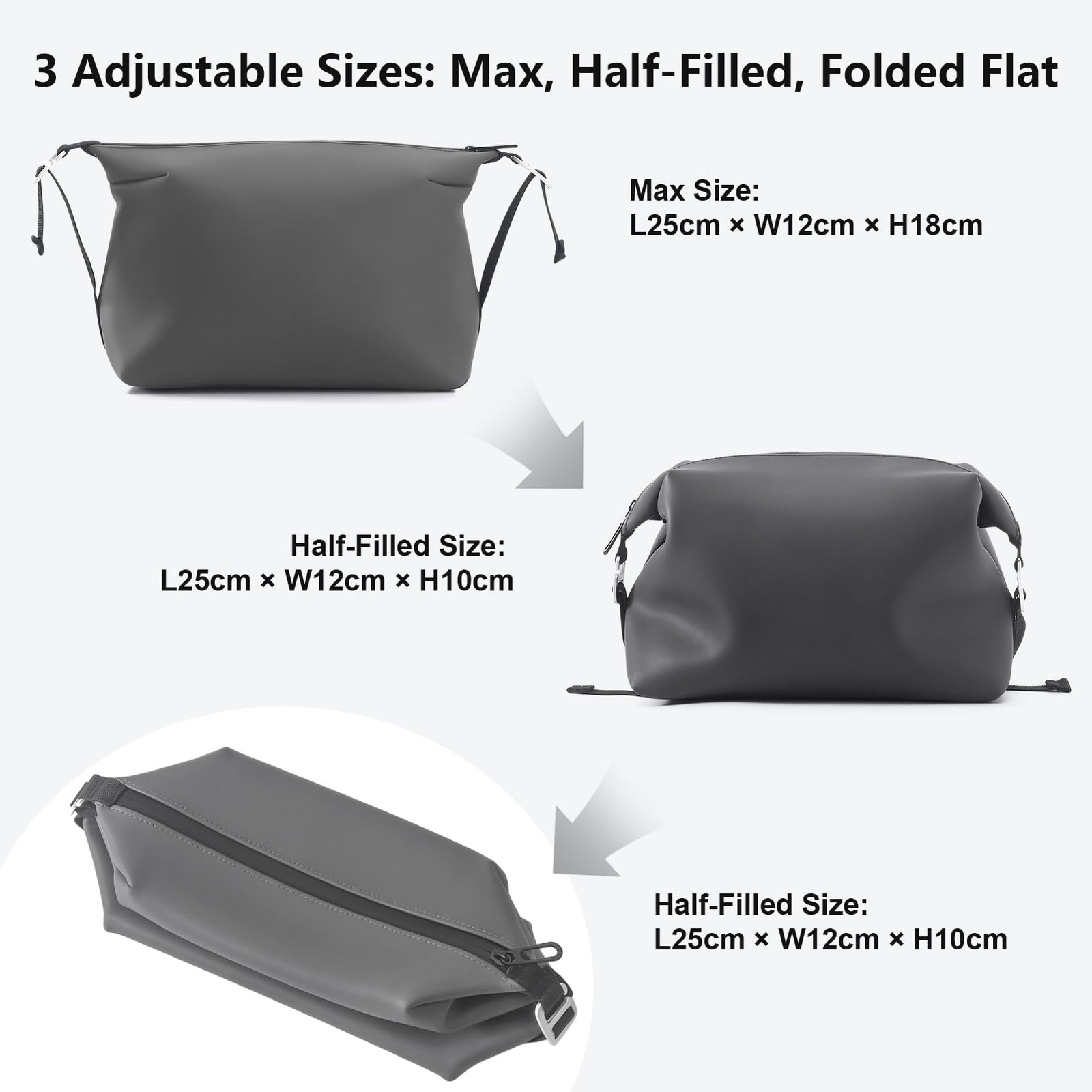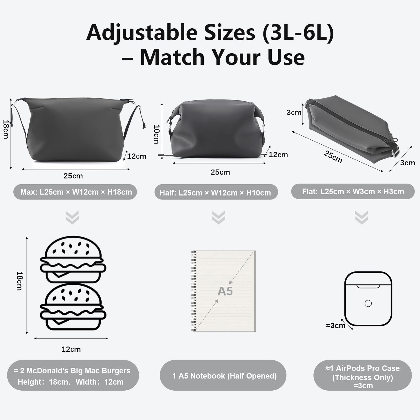 Silicone Toiletry Bag - Ultimate Leakproof Waterproof Travel Organizer for Men & Women Silicone toiletry bag combines innovative design with practical functionality for all your adventures. This waterproof leakproof cosmetic organizer features military-grade sealing technology that protection against spills and leaks. The lateral G-buckles allow you to customize the bag's profile - compress it for compact storage or expand it to accommodate all your essentials. With generous 6L capacity, this spacious organizer comfortably stores full-size shampoo bottles, skincare products, makeup collections, shaving kits, and dental care essentials for extended vacations or business trips. The practical textured base design provides exceptional stability on wet bathroom counters and shower floors while promoting quick water drainage. Made from eco-friendly odor-resistant silicone material, this durable bag maintains its shape through countless journeys. When not in use, the flexible construction folds neatly into your luggage compartment or carry-on bag. Perfect for countless occasions including business conferences, weekend getaways, gym workouts, camping trips, beach vacations, cruise holidays, spa days, and festival preparations. This versatile organizer makes an exceptional Christmas gift, birthday present, graduation gift, or anniversary surprise for him and her.The non-porous surface resists stains and cleans effortlessly with simple wiping. Additional features include: hanging capability for bathroom organization, lightweight construction for easy packing,and sustainable materials for environmentally conscious travelers.The sophisticated unisex design appeals to both men and women who value organization and style. Ideal for: frequent flyers,outdoor enthusiasts,fitness lovers,professional travelers,vacation planners,organized packers. This multi-functional bag serves as cosmetic case,makeup pouch,dopp kit, shower caddy,medicine organizer,first aid kit holder. A sealed waterproof zipper on the main compartment prevents liquid leaks. Adjustable lateral G-buckles compress the bag to secure contents. The 6L interior holds multiple standard 16oz (500ml) bottles and toiletry essentials. A textured flat base keeps the bag stable on wet surfaces and allows water to drain. The silicone material folds for storage in luggage.