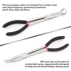 Comprehensive 6-Piece Hose Gripper and Needle Nose Pliers Set Discover the ultimate toolset designed for durability and precision. Crafted from high-quality carbon steel, this set is built to last, offering high hardness and resistance to corrosion and rust. It's also easy to clean, ensuring your tools remain in top condition. Set Includes: 3-Piece 11" Hose Gripper Plier Set: Includes pliers with diameters of 5/16 inch, 1/2 inch, and 3/4 inch for versatile applications. 3-Piece Extra Long Needle Nose Pliers Set: Features a 1" Long Nose Plier, along with 90° & 45° Bent Nose Pliers for intricate tasks. Key Features: Extra Long Reach: The 11-inch length provides access to narrow spaces while protecting your hands from injury. Versatile Functionality: Round jaws are perfect for grasping hose ends for easy removal or installation. The straight long reach and bent nose pliers are ideal for gripping small parts, bending, forming, twisting wires, and handling small fasteners. Ergonomic Design: Comfortable handles ensure a secure grip, making them suitable for extended use without discomfort. This comprehensive toolset is perfect for professionals and DIY enthusiasts alike, offering the precision and durability needed for a wide range of tasks.