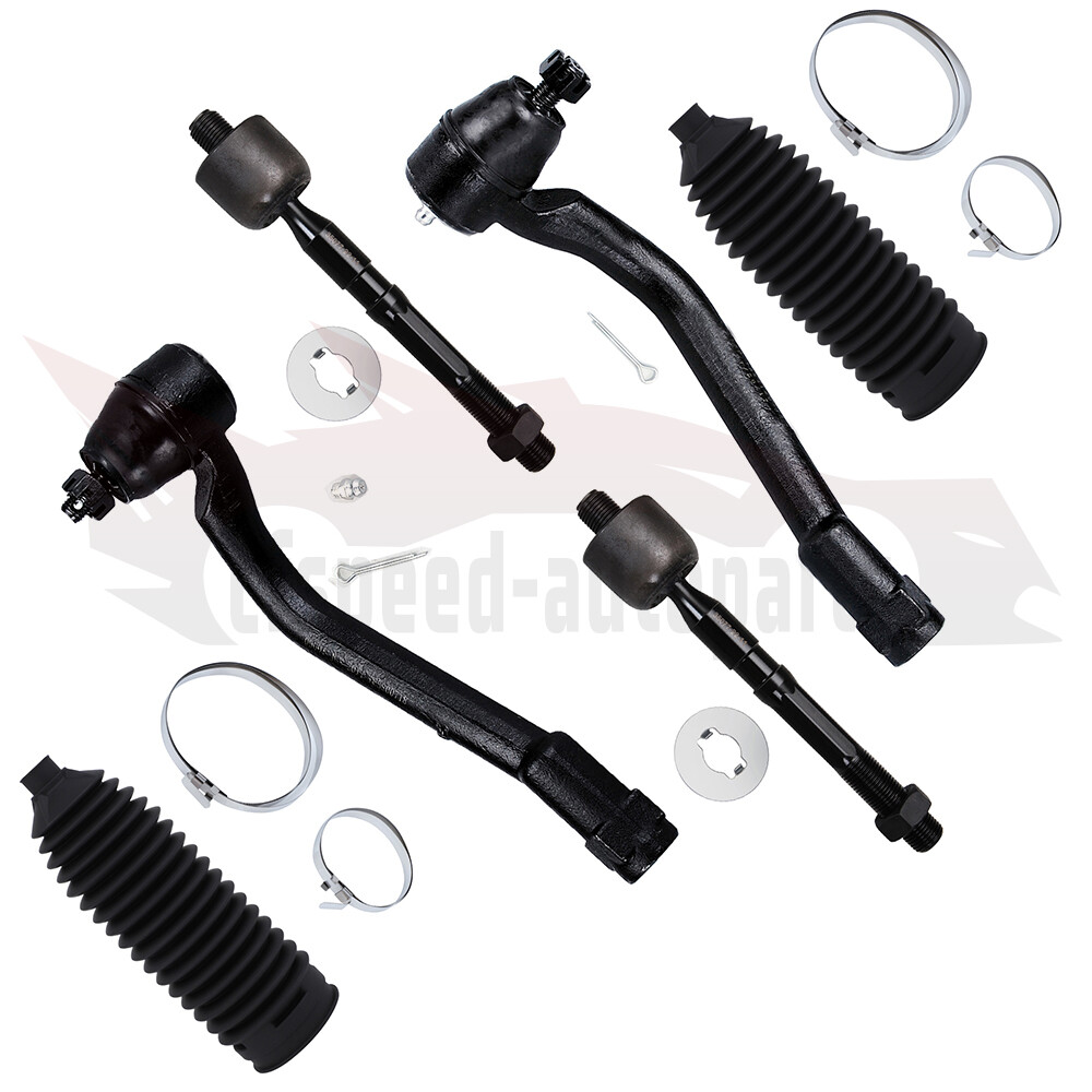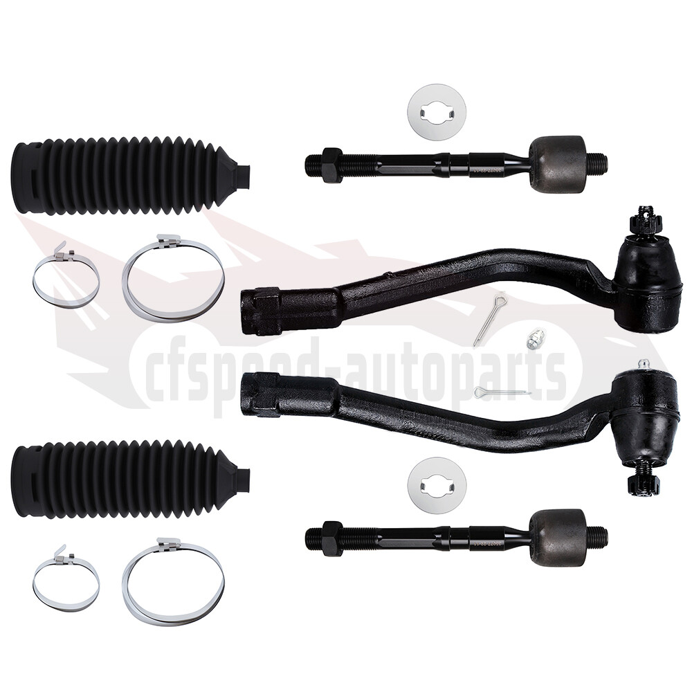 1.Notes (1).Please check the fitment chart above before payment making sure all the suspension parts listed on this page are compatible with your automobile. (2).Please refer to Moog official website before narrowing down your search so as to avoid unnecessary item not as described return requests. (3).Please contact our customer services for targeted discount after all the items are received if you have reached any targeted discount thresholds, the terms of which is at the bottom of this page. 2.Fits These Vehicles 2012-2017 Hyundai Azera 2011-2013 Hyundai Sonata 2014-2015 Kia Cadenza 2011-2015 Kia Optima 6PCS Front Outer Inner Tie Rod End For 2011-13 Hyundai Sonata 2011-15 Kia Optima 1.Notes (1).Please check the fitment chart above before payment making sure all the suspension parts listed on this page are compatible with your automobile. (2).Please refer to Moog official website before narrowing down your search so as to avoid unnecessary item not as described return requests. (3).Please contact our customer services for targeted discount after all the items are received if you have reached any targeted discount thresholds, the terms of which is at the bottom of this page. 2. Fits These Vehicles 2012-2017 Hyundai Azera 2011-2013 Hyundai Sonata 2014-2015 Kia Cadenza 2011-2015 Kia Optima 3.Package Includes 1x Front Outer Tie Rod End - Driver Side -ES800717 1x Front Outer Tie Rod End - Passenger Side -ES800718 2x Front Inner Tie Rod End -EV800974 2x Rack and Pinion Bellow Ball Joint Replacement Guideline: If there is a knocking or clunking noise in the area of the front axle when the car is traveling over road bumps, potholes or curbs, then there is usually a defect in a component of the wheel suspension. Picture(A) The side of the front axle from which the (vibration) noise is emanating can already be determined during a test drive. The type of noise also already provides certain indications for maintenance regarding which components might be faulty. Picture(B) 1.Raise the vehicle and remove the front wheels. 2.To loosen the fastening screws and fixing nuts of the compression ball joint more easily, spray them with rust remover and allow to act for a few minutes. Picture(C) 3.Loosen the fastening screws of the broken ball joint on the control arm and remove the nuts. Picture(D) 4.Loosen and remove the fixing nut of the ball joint on the steering knuckle. Tip:If the ball stud rotates, hold the ball stud in place with a hexagon socket. Picture(E) 5.Remove the bad or worn ball joint from the control arm. 6.Loosen the compression ball joint on the steering knuckle using a suitable special tool. Picture(F) 7.Clean the cone connection. Tip:For better sealing and durability of the ball joint sleeve, a little silicone grease can be applied to the contact surface. Picture(G) 8.Insert new compression ball joint in the control arm and steering knuckle and tighten with new fixing nuts. 9.Reinstall front wheels. Lower the vehicle and tighten the wheel studs to the tightening torque specified by the vehicle manufacturer. 10.Measure the chassis and adjust it using the various holes on the compression ball joint if necessary. 11.Finally, carry out a test drive. Sway Bar Stabilizer Link Replacement Guideline: While driving, the following signs may indicate a faulty sway bar stabilizer link: (1).Rattling and thumping noises on rough roads. (2).Imprecise vehicle handling. (3).Stronger inclination of the vehicle during cornering. If the sway bar stabilizer link is found to be defective, it should be replaced as described below. Picture(A) 1.Raise vehicle and remove front wheels. Tip:Always check both stabilizer links and replace them in pairs if necessary. 2.Spray fastening nuts of the stabilizer link with rust remover and let act for a few minutes. Picture(B) 3.Loosen the lower fastening nut of the stabilizer link at the stabilizer and remove. Tip:If the ball stud also starts to turn, hold it with a suitable tool. 4.Press stabilizer link out of torsion bar. Picture(C) 5.Loosen the upper fastening nut of the stabilizer link at the suspension strut and remove it. Tip:If the ball stud also starts to turn, hold it with a suitable tool. Picture(D) 6.Press stabilizer link at suspension strut out of bracket. Picture(E) 7.Insert new stabilizer link at suspension strut. Picture(F) 8.Tighten stabilizer link at suspension strut to the tightening torque specified by the vehicle manufacturer. Tip:Secure the ball stud against twisting with a suitable tool. Picture(G) 9.Insert new stabilizer link at stabilizer. 10.Tighten stabilizer link at stabilizer to the tightening torque specified by the vehicle manufacturer. Tip:Secure the ball stud against twisting with a suitable tool. Picture(H) 11.Remount the front wheels. Lower the vehicle and tighten the wheel studs to the tightening torque specified by the vehicle manufacturer. Tip:Even if replacing the stabilizer link does not directly affect the chassis setting, we recommend checking the axle setting and adjusting if necessary after working on the suspension. 12.Conclude with a test drive. Tie-Rod End Replacement Guideline: If you feel a bump in the steering when driving over road bumps or curbs, this might be due to worn tie rod ends or inner tie rods. Clicking noises during sudden steering movements can also be symptoms of a defective tie rod. In order to determine the exact cause and replace the defective tie rod, the car must be elevated with a vehicle lift in order to be examined more closely. This useful tip applies to the exchange of tie rod ends and inner tie rods, which together form the so-called tie rod. Picture(A) Note: Cleanliness is extremely important when working on the power steering. Incorrect work and contamination can lead to leakage and, in the worst case, to failure of the steering assistance. 1.Lift the vehicle and dismount the front axle wheels. 2.Spray the fastening nut of the tie rod end with rust remover and leave it on for a few minutes. Pictur