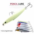 6PCS/Lot 7.5cm/10g Pencil Hard Bait Topwater Popper Crankbait Fishing Lure Trout Description: Weight: 10g/piece Length: 7.5cm/piece Material: Environment-friendly ABS Hard Plastic Hook: 8# High Carbon Steel Treble Hook Color: 6 colors available Including: 6x Fishing Lures Note: -The hook is extremely sharp. Please take care for handle it. -Keep it out of children's reach. -All the pictures are taken in kind.Camera maybe appear off color, please in kind prevail,thanks. -Manual measurement maybe be error. Please in kind prevail, thanks! -Colors are arranged randomly,usually we all mix. Feature: -They create lifelike swimming actions in water. -3D eyes make it a powerful catching tool. -Bright colors to attract big fish. -Smooth and rapid diving action. -Suitable for freshwater and saltwater. -Environment-friendly ABS plastic can be reused and stored for a long time.