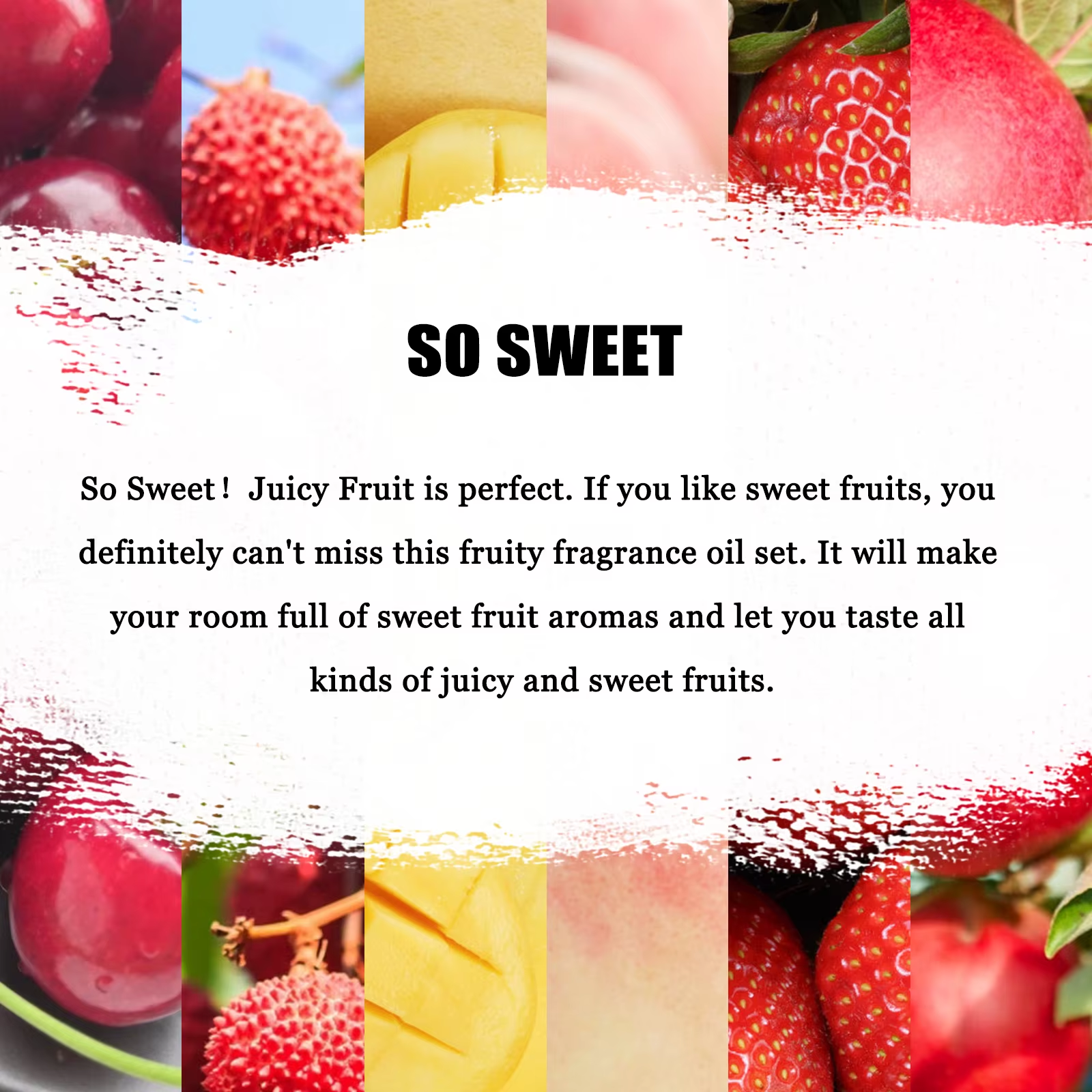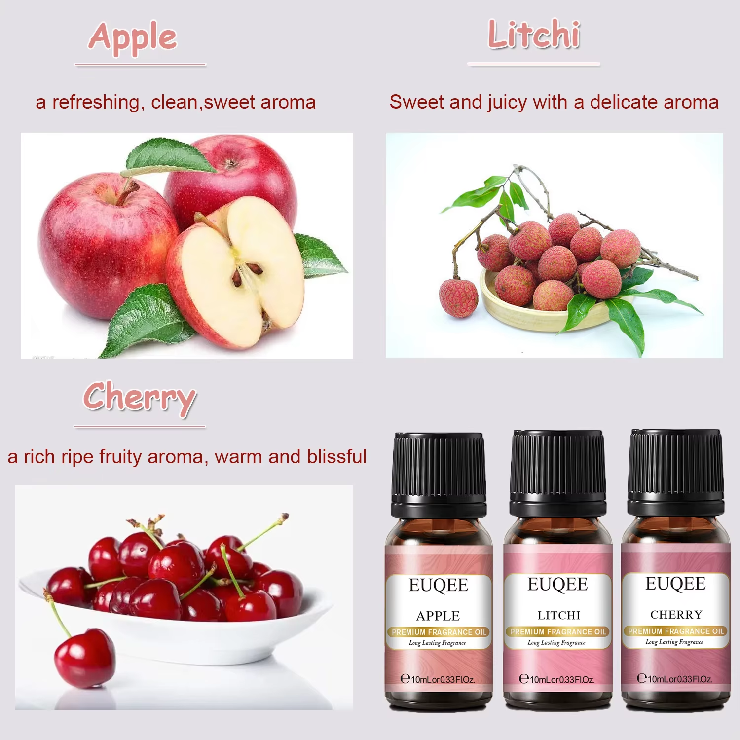 This set of fruit fragrance oils is amazing! The scents are rich, natural, and long-lasting—perfect for diffusers, candles, or DIY projects. Strawberry, cherry, litchi, apple, mango, and peach create a refreshing atmosphere at home. The oils are high-quality, not overpowering, and blend well. Great value for six vibrant fragrances in one pack!