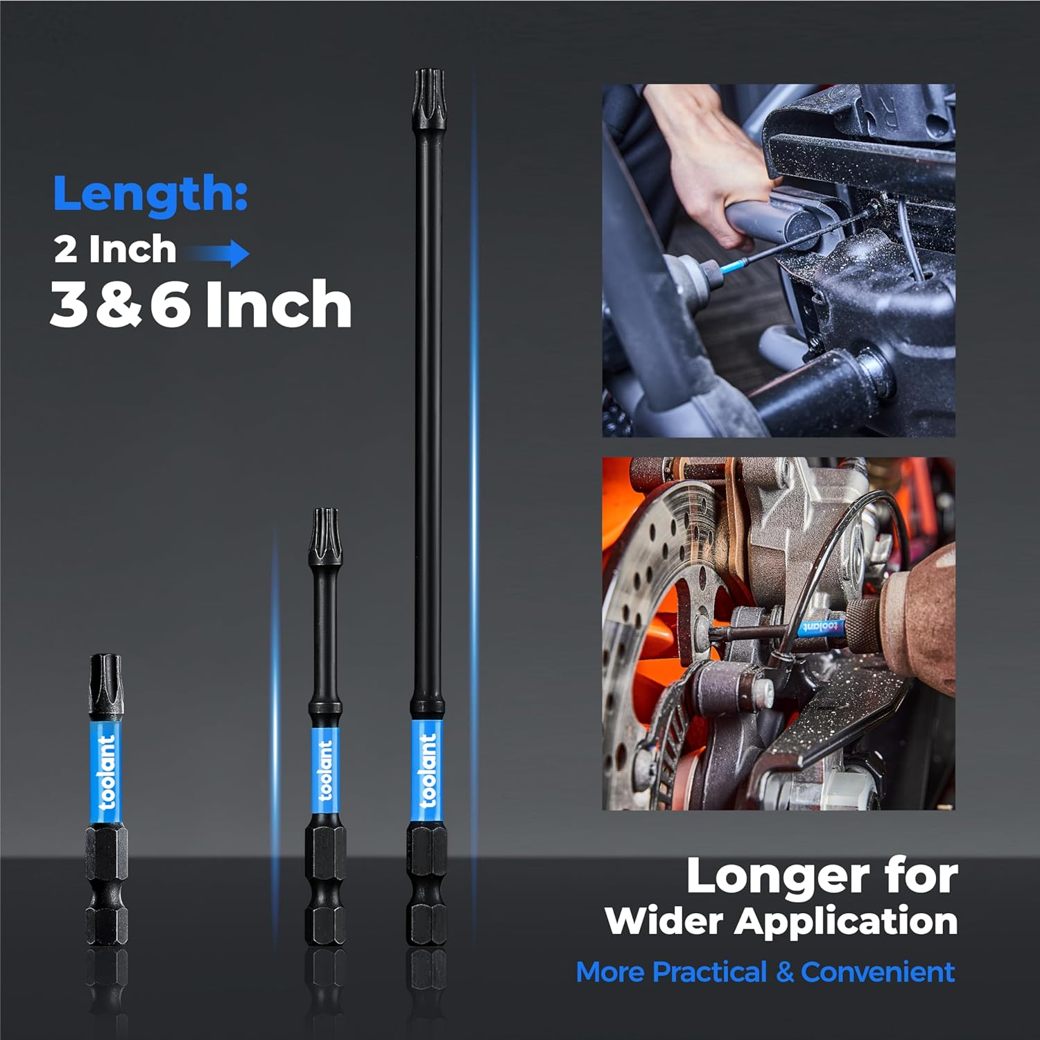 toolant impact security torx bit set 13pcs. Torsion zone to absorb torque peaks to avoid breakage. 10 times life expectancy versus standard bits. For impact driver, drill and screwdriver. 13pcs tamper proof torx bits-tt7, tt8, tt9, tt10, tt15, tt20*2, tt25*2, tt27, tt30, tt35, tt40-1/4” quick release hex-shank, 6” long. CNC machined tips, S2 alloy steel body, hardened core to increase bit strength and reduce fracture. Manganese Phosphate surface to prevent rust. Strengthened magnetic impact torx bits helps you easy pick up screws. The magnetism doesn’t decay after multiple uses. Widely used in home repairs, automobiles, woodworking and other screw driving applications. All day after-sale service. Thanks for choosing toolant. Product Description toolant Impact Torx Bit Set Features S2 Alloy Steel Industrial heat-treated high quality steel body to ensure durability CNC Machined Magnetic Tip CNC manufactured precision-engineered magnetic tips reduces breakage and cam-out Torsion Zone Absorbs high torque of impact driver to avoid fracture when heavy screw driving,10X lifetime over standard bit Phosphating Surface Rust-proof treatment to ensure good condition even in humid environment SAFETY TORX BIT LONGER FOR WIDER APPLICATION 1 MOTORCYCLE 2 MACHINE 3 CHAIR toolant Impact Bit Set Add to Cart Add to Cart Add to Cart Add to Cart Add to Cart Customer Reviews 4.6 out of 5 stars 3,316 4.7 out of 5 stars 5,568 4.5 out of 5 stars 633 4.6 out of 5 stars 173 4.6 out of 5 stars 237 Price $13.99 $ 13 . 99 $12.99 $ 12 . 99 $11.99 $ 11 . 99 $20.99 $ 20 . 99 $39.99 $ 39 . 99 Material S2 Alloy steel S2 Alloy steel S2 Alloy steel S2 Alloy steel S2 Alloy steel Impact resistance √ √ √ √ √ Drive System torx hex philips impact bit set torx Magnetism √ √ √ √ × Number of Pieces 27 20 11 52 8 Size T7-T40 Metric:1.5-8mm SAE:5/64”-5/16” ph2 1",2",4"&6" 1"&3.5" T30-T70