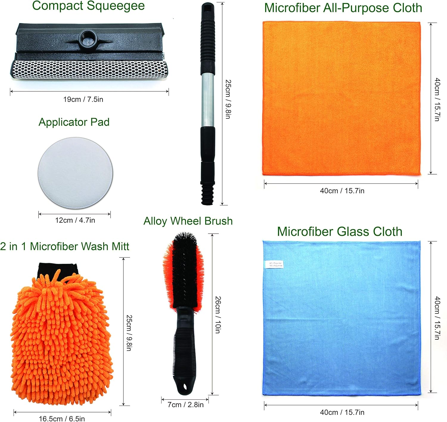 Car Wash Kit – 6 Cleaning Tools Includes Windshield Squeegee, Wheel Brush, Microfiber Mitt, Cleaning Towels and Wax Applicator Pad – Premium Car Care Set for Exterior and Interior Detailing FULL PROFESSIONAL CAR CLEANING KIT: Your car wash and wax kit includes all supplies and tools, an all-purpose microfiber cloth, a microfiber glass cleaning cloth, an alloy cleaning brush, an 2 in 1 microfiber noodle wash mitt, an compact squeegee, and an applicator pad to keep your car at its best - see pictures for full bundle details. KEEP YOUR CAR BODY BEAUTIFUL AND DURABLE: A good cleaning kit with decent car wash soap, wheel cleaner and polish can prolong the life of your car body - and keep it maintaining to be looking its best for its full lifetime with you. KEEP YOUR WHEELS AND WINDOWS CLEAN TOO: The microfiber window cleaning cloth, compact squeegee and the alloy brush let you keep your whole car clean - windows and wheels too. Because when you want your car to look the best, you need shiny wheels and clean windows too. ONLY QUALITY MATERIALS: We use only the best polyester blends for our microfiber items, durable rubber for the squeegee and strong fibers for the alloy brush, so your car can look its best with the help of this kit over the long term. Cleaning On All Levels This cleaning kit lets you keep your whole car clean. The body and interior with the soft microfiber cloth, 2 in 1 noodle wash mitt, and applicator pad. The windows with the microfiber glass cleaning cloth and the durable squeegee. And the tires with the handy and convenient alloy brush. Whatever your cleaning needs, from scrubbing off dirt from your hood, doors, or headlight till washing and waxing your auto without making a scratch this kit’s got you covered. Keep Your Car Brand New Keeping your car clean is a crucial part of preserving that “new” look. A good wax - which our applicator pad will help you spread out perfectly - can keep your paint safe from harmful UV rays. And a easy regular polish of your interior and exterior will keep things looking new for years to come. A Durable Kit For Long Term Use We understand that keeping your “baby” clean is a long term effort. Which is why we’ve ensured this set is made from high quality microfiber, rubber and other materials, so you can keep your car, van, truck, or even your motorcycle looking its best and shine for the long term. The Perfect Gift For Your Car Enthusiast Friend Got a friend who loves their ride? Nothing says thoughtful like a professional car cleaning kit. Get one for yourself by all means - but don’t forget your father in law, best friend or brother - help them keep their cars spotless too. Your Satisfaction Is Our Guarantee No matter what, you’ll be satisfied with this professional kit. If you’re unsatisfied with anything, we’re there for you. We offer an iron-clad 30 day satisfaction guarantee. If there’s anything you’re unhappy with, we’ll make it right. We’ll replace your kit or give you a full refund. Get Your Professional Car Cleaning Kit Now And Keep Her Looking Like New All Her Life Item model number B07SYB85V3 Manufacturer Part Number 01 63 Item Weight 1.23 pounds Voltage 12 Volts Package Dimensions 11.5 x 7.52 x 4.17 inches 7.52 inches x 11.5 inches x 4.17 inches. Weight: 1.23 lb Shipping from the USA All of our products are shipped from the USA, ensuring quick delivery to your destination. Payment We offer the following payment methods: PayPal, credit card, bank transfer, and eBay's secure payment system. Free Shipping & Free Returns Shipping within the USA is FREE. Additionally, any return is absolutely free for you. Risk-Free Purchase You have the option to return an item within 30 days without any justification. We cover the return shipping costs! Fast Shipping We ship immediately upon receipt of payment. Generally, the package is delivered within 2-3 days in the USA. If it takes longer, we will contact you. Quality and Costs Made in Europe, USA, China No customs fees or additional charges Total satisfaction guarantee Invoice with declared VAT available upon request in .pdf format Feedback Your feedback is very important to us. After you pay for your purchase, you will automatically receive positive feedback from us.