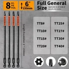 [Advantage of DYRECELVE] Embrace professional-grade, authentic tools from an esteemed international brand, empowering over 2 million users with our cutting-edge technology [Long Torx Bit Set 6-Inch] This 8-Pack torx bit with hole in center of has a length of 6 inches, including T8, T10, T15, T20, T25, T27, T30, T40. Each drill bit is clearly labeled with its size [Upgraded Industrial Strength Material] Long Torx Security Bit Set are made of solid S2 alloy steel with a hardness reaching 60 HRC, torsion zone to absorb torque peaks to avoid breakage [CNC Machined Tips] This tamper proof torx bit set and is of torx security bits. It features a quenched core and a manganese phosphate surface. 1/4'' Hex-Shank quick release, with a bit holder [Enhanced Magnetic] Impact magnetic torque bits facilitate screw retrieval, and the magnetism remains intact even after multiple uses, so you don't have to worry about its decay over time [What You Get] A set of 8 professional-grade 6 inch Long star bit sets for home repairs, repairing electronic products, auto repairs, woodworking and other screw driving applications. It is an essential tool for DIY enthusiasts and mechanics