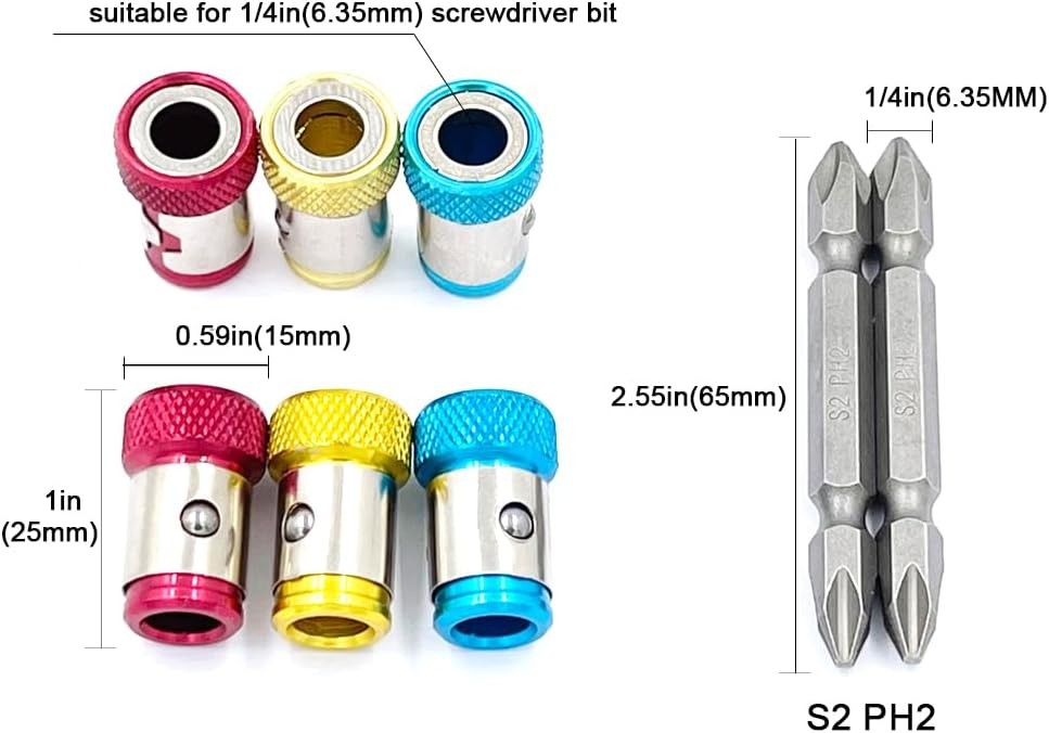 6 Pieces Magnetic Screw Ring With 2 Ph2 Screwdriver Bit One Size, Mix Product Details Brand: JFOGO Item Length: 65 Millimeters Material: Aluminum, Alloy Steel Drive System: Slotted, Torx, Hex, Phillips Finish Type: Painted Number of Pieces: 6 Manufacturer: JFOGO Item Weight: 3.2 ounces Country of Origin: China Size: One Size Color: Mix Finish: Painted Compatible Fastener Range: 0.25 inches Batteries Included?: No Batteries Required?: No Brand: JFOGO Item Length: 65 Millimeters Material: Aluminum, Alloy Steel Drive System: Slotted, Torx, Hex, Phillips Finish Type: Painted The screwdriver head magnetic ring is suitable for 1/4 inch shank screwdriver bits,compatible with phillip, hex,torx,slotted and other screwdriver bits Hold the screws easily and quickly for screwdriver bits,improve work efficiency The magnetic screw rings consist of aluminum tubes, steel beads, and magnetic blocks Phillips Screwdriver Bits made of S2 Alloy Steel Set includes 6 pieces magnetic screw ring and 2 pieces ph2 screwdriver