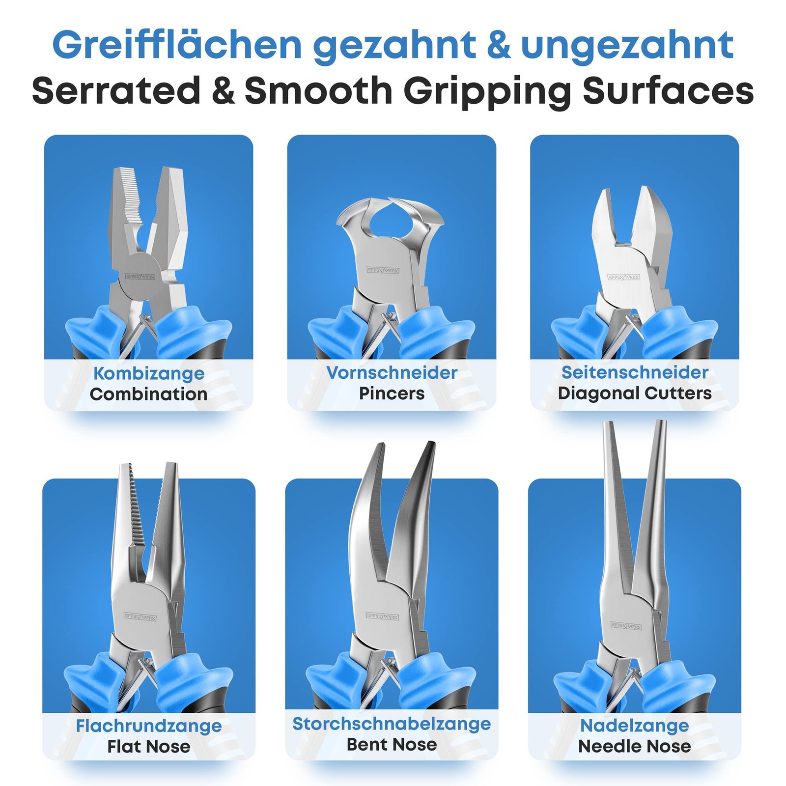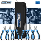 EWerk - 6-Pc Mini Pliers Set - Linesman, Long Nose, Needle Nose, Bent Nose, Diagonal Cutting & Wire Cutters - Electrician Tool Kit w/ Small Pouch - Use for Jewelry Craft & Electronic Repairs HANDY TOOL KIT - Enjoy effortless cutting, holding, and gripping different shaped small objects w/ ease as you breeze through your crafts; Handy tool set for electricians, mechanics & craftsmen; Ideal for repair work of electronics & home appliances SERRATED & NON-SERRATED JAWS - Experience optimal gripping strength w/ both serrated & non-serrated surfaces; Get precision and achieve neat, professional results in all your projects NON-SLIP ERGONOMIC HANDLES - Non-Slip rubber handles w/ comfort grips provide holding convenience; Equipped w/ double spring for automatic opening, ensuring you work w/ ultimate ease in all your projects COMPLETE SET - 6-Piece mini-pliers set featuring combination / linesman pliers, flat / long nose, bent nose, needle nose, pincers & diagonal / end-cutting pliers; Easy to carry w/ convenient storage pouch TRUSTED QUALITY - EWerk is a globally trusted company dedicated to bringing utmost convenience to your daily life and industrial operations; All tools are manufactured using top-quality materials to ensure lasting performance and durability
