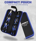 Mini Pliers Sets 6-piece 【ALL IN ONE】This 6pcs pliers set contains commonly used pliers for daily needs, including 5" combination pliers, 4.5” diagonal cutting pliers, 5” needle nose pliers, 6” long nose pliers, 5” bent nose pliers, 4.5” end cutting pliers. 【A MUST FOR DAILY LIFE】6 pieces mini pliers set is designed for installation and repair of precision instruments or parts in narrow locations. It's perfect for a variety of clamping or cutting tasks, repair the phone, cut the steel wire, make jewelry etc., 【INCLUDING A BENT NOSE PLIERS】Long, 90°bent tip perfect for grabbing, holding, shaping, twisting and pulling in all directions; Thin nose profile gets into tight spaces and makes it easy to reach around obstructions. 【STURDY STORAGE BAG】These pliers come with a sturdy carrying bag, which fits easily in your tool box, car compartment, or locker. 【WORRY-FREE ORDER】focuses on making the best tools affordable. We appreciate and value your business. Please don't hesitate to shoot us an email if you have any feedback, suggestion, or comment. We will reply to you within 24 hours. 【COMFORTABLE GRIP】Our pliers feature spring-loaded bi-material TPR handles, which are designed to prevent grip fatigue and keep the pliers from slipping out of your hand while you work on your projects.