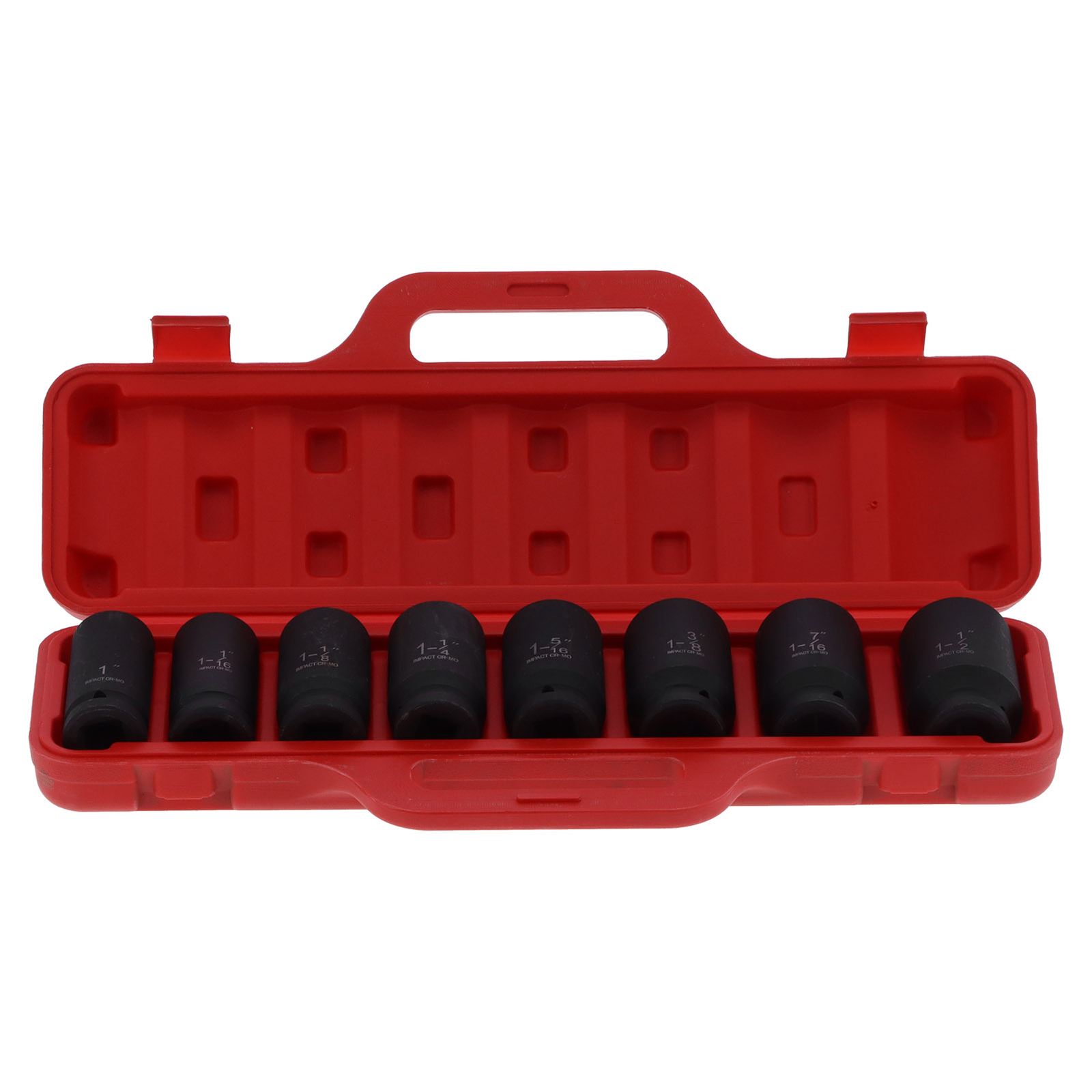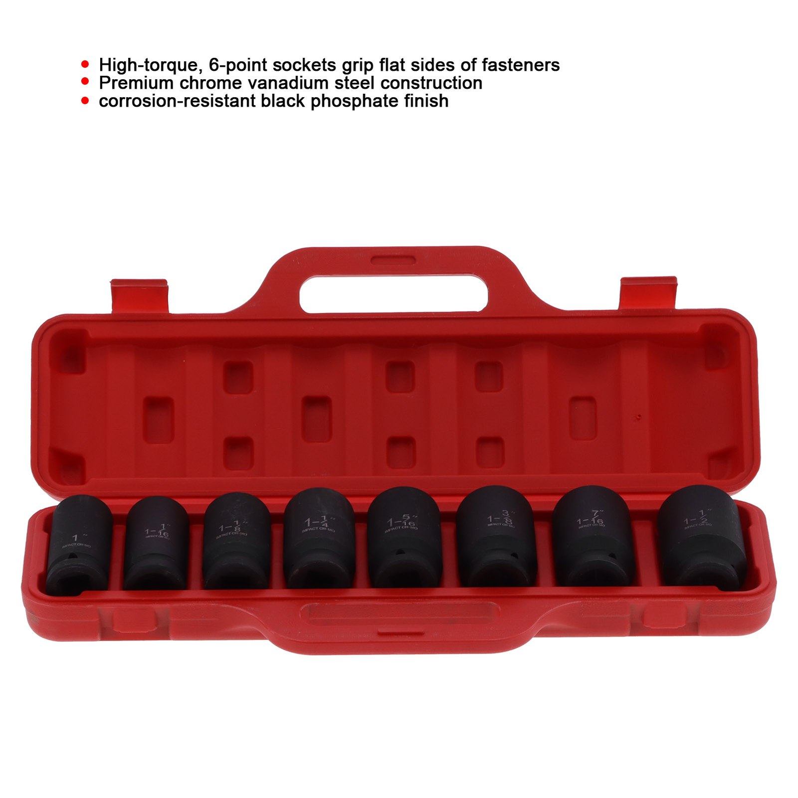 Feature: 1. High‑ , 6‑point sockets grip flat sides of fasteners, not corners, preventing round‑off. 2. Premium steel construction with corrosion‑resistant black phosphate finish. 3. High‑contrast permanent ‑etched size markings, easy to read even in low light conditions. 4. The socket set is designed to use with impact wrenches, it is a perfect choice for you. 5. 8PCS sleeves, equipped with complete automative tool, almost including most of what you need. Specification: Item Type: Socket Set Material: Steel Box Size: Approx. 50 x 19 x 8cm / 19.7 x 7.5 x 3.1in (Length x Width x Height) Package List: 1 x 1in Socket 1 x 1-1/16in Socket 1 x 1-1/8in Socket 1 x 1-1/4in Socket 1 x 1-5/16in Socket 1 x 1-3/8in Socket 1 x 1-7/16in Socket 1 x 1-1/2in Socket