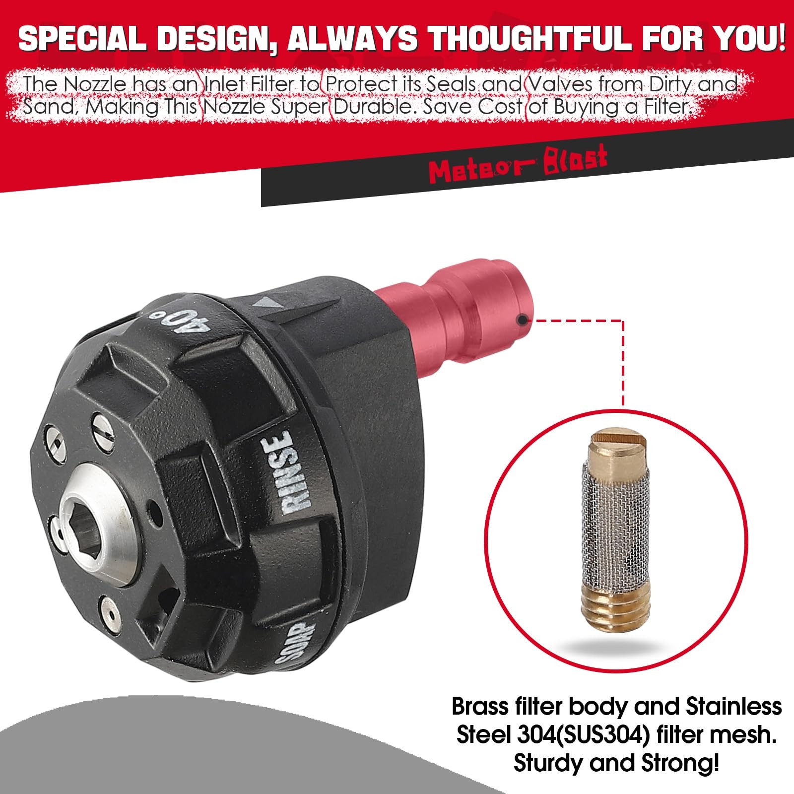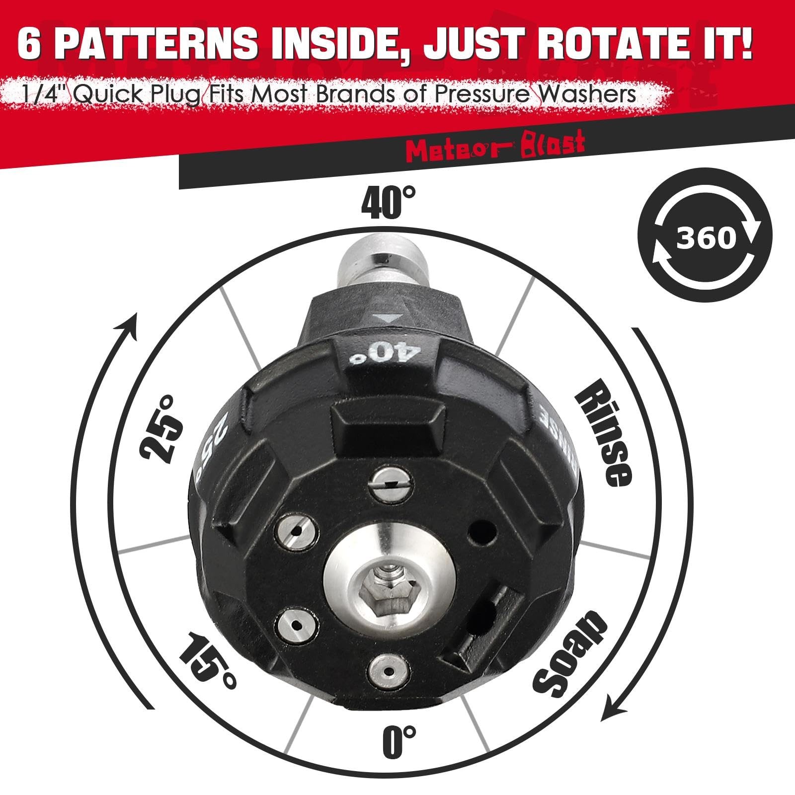 Who are we? Our team was built on year 1999 that specialized in pumps, tools and accessories. Our team constantly working hard to provide safer, reliable, high-efficiency and affordable tools and accessories. We promise to reply your message within 10hours .Every unit of our tools and accessories have been examined to guarantee safe and before sending to Amazon Warehouse. All of our products 100% follow Amazon Shopping Policy, you are entitled to a replacement or refund for defective. How is the Nozzle? You will feel relieved by using this nozzle for various cleaning works especially for hard to reach areas, remote rinse,detergent. It provides 6 different fast-switching patterns include standard 0 °, 15 °, 25 °, 40 °, Soap and a rinse function which is very long range but low pressure. Note: Rinse function is a special angle that provide very long range but low pressure, it can be used for simply watering in garden and yard, also long Distance scour CAUTION: Before pulling the trigger, please rotate the nozzle to the limit slot. Do not rotate the nozzle when spraying water, otherwise the high-pressure water will damage the sealing parts in the nozzle. 6 in 1 Quick Adjustable Nozzle: Provides 6 different fast-switching patterns include Standard 0 , 15 , 25 , 40 degree and soap nozzles, aslo special and useful rinse nozzle. Just rotate to select among 6 patterns super easily and quickly. Keep it on pressure washer wand, You have ALL Functions and ready to go! Max working pressure is 4500psi and 2.5GPM (Orifice 2.5). Please check image 7 to select suitable orifice if you're not sure about it. Great Design: High precision contraption reduce weight and improve efficiency by using stronger but lighter Head, austenite stainless steel thickened swivel valve, austenite SUS304 nozzles and solid brass swivel base. The inlet is antirust stainless steel 1/4in Plug and it easily attach to pressure washer wand, compatible with Simpson, Karcher, Ryobi, MTM, Honda, Greeworks, Craftsman, Troy Bilt, B&S, Generac, Husqvarna,Powerstroke, Champion and more high pressure washers. Upgrade Feature:The inlet plug has a REMOVABLE filter to protect its seals and valves from dirty and sand, save your cost of buying a filter. Brass filter body and Stainless steel filter mesh, extremely long durability and strong! Extra: You will find many spare parts in the package , they're for maintaining after years, no need to install any of them into nozzle before use. Save the cost for buying a new nozzle buy just change the spare parts, and ready to pressure washing again. Great time saver and versatile: Undoubtedly this well-designed nozzle will save you unimaginable time during regular pressure cleaning job if you don't like changing different angle nozzles which waste your time. You will love this nozzle after using, small body offer huge power and "easy to use" cleaning experience. Strong packing, Professional on Pressure Washer and Accessories. We Always Stand Firmly Behind This Nozzle and You. Welcome to pressure washer centrer store.