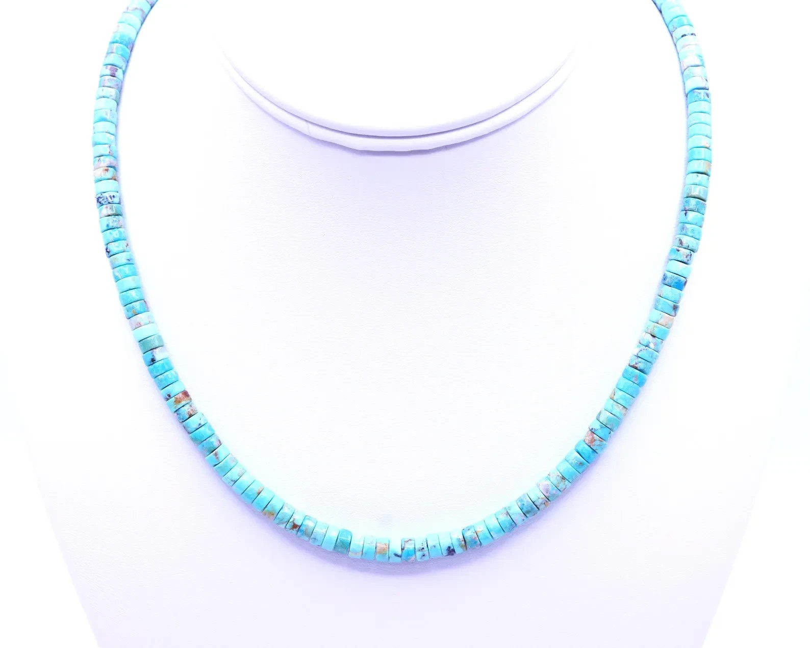 This classic necklace is crafted with high-quality AAA-grade natural 6mm blue-green turquoise heishi beads from Arizona, USA. The stones display beautiful shades of bluish green with subtle golden-brown matrix. Each bead is evenly cut with clean edges, uniform sizing, and a superior satin polish that gives the necklace a refined and finished appearance. The strand is professionally strung on strong micro-woven stainless-steel beading wire with a nylon coating for durability and flexibility. It is finished entirely in solid 14k gold, including a large, easy-to-use clasp and a complimentary 2" 14k gold extender. If you prefer the necklace without the extender, feel free to send a message. This turquoise is 100% natural—never dyed, treated, or color-enhanced. Photos are taken in natural sunlight and in a light box with no filters or digital enhancement. Available in lengths from 14" to 28". Please select your preferred size from the drop-down menu. Feel free to reach out with any questions. I respond quickly and am happy to help. Origin & Metaphysical Properties Arizona turquoise was first discovered over 1,500 years ago by Native American tribes and remains the global benchmark for high-grade turquoise. Found in copper-rich mountain formations, it is prized for its clean bluish-green hues and minimal matrix. Copper produces vibrant blue tones, while iron brings out green shades—resulting in the unique blue-green mix Arizona turquoise is known for. Turquoise is widely regarded as a purification stone. It is believed to promote peace, serenity, emotional healing, and self-confidence. Details Bead Size: 6mm natural turquoise heishi Color: Bluish green with golden-brown matrix Finish: Satin polish Metal: Solid 14k gold clasp and findings Necklace Length: 14"–28" Accessories: Includes 2" 14k gold extender (removable upon request) Styling: Unisex, suitable for men or women Packaging: Gift-ready presentation box Processing Time: Ships within 3 business days Shipping U.S. Standard: USPS First-Class Mail (typically 2–4 business days; up to 9 days per USPS guidelines) International Standard: USPS First-Class International (typically 10–21 business days)