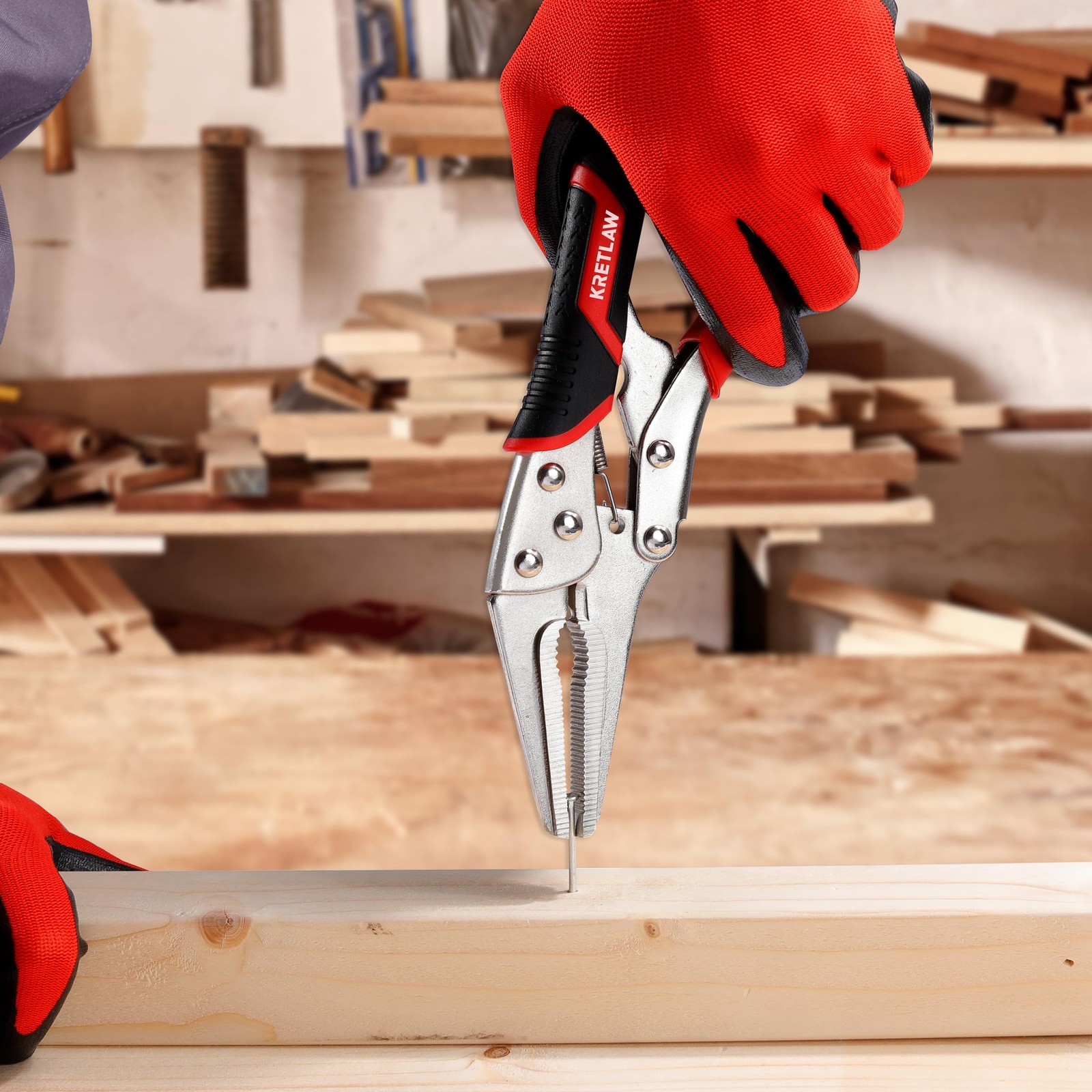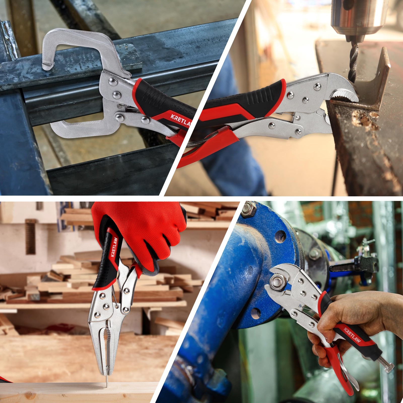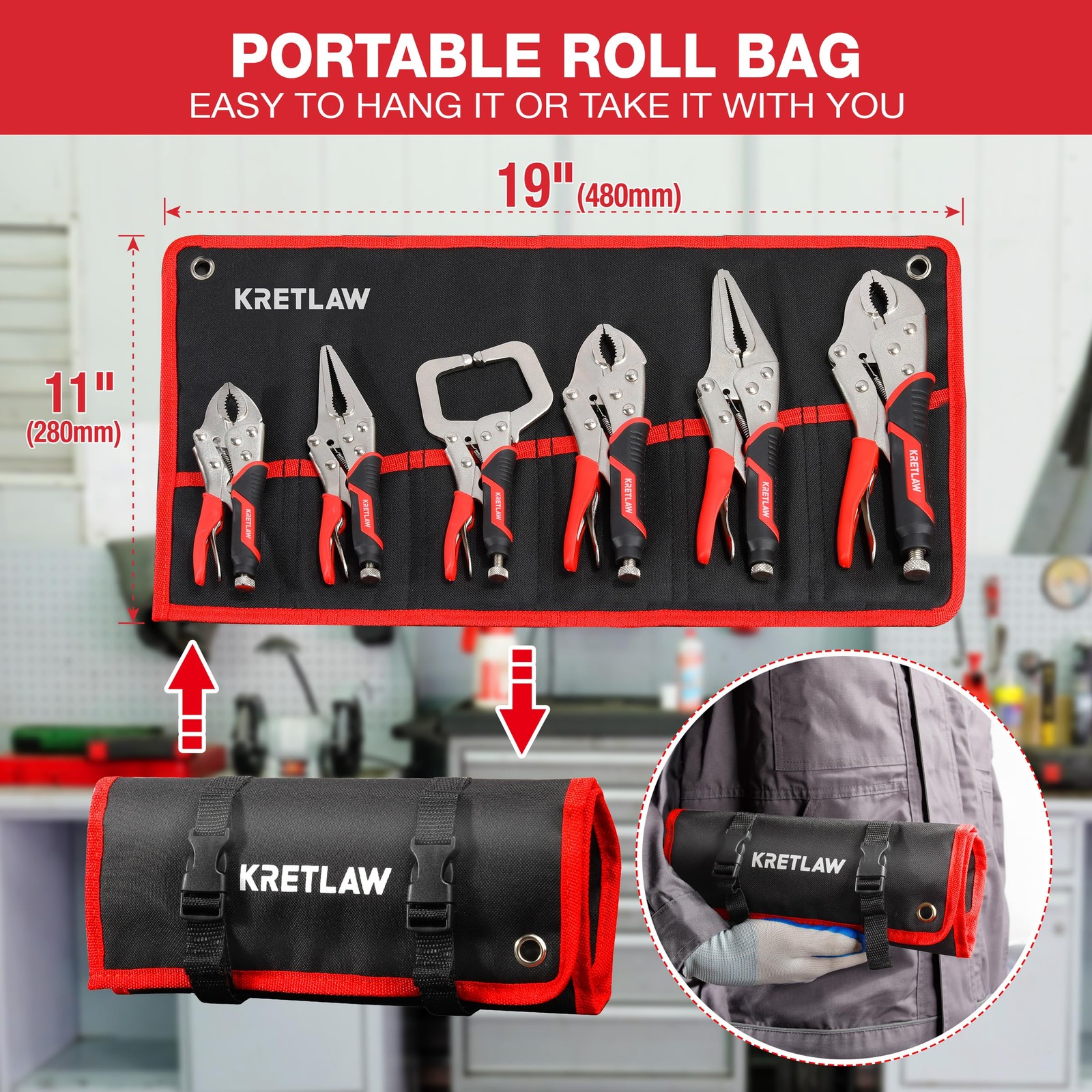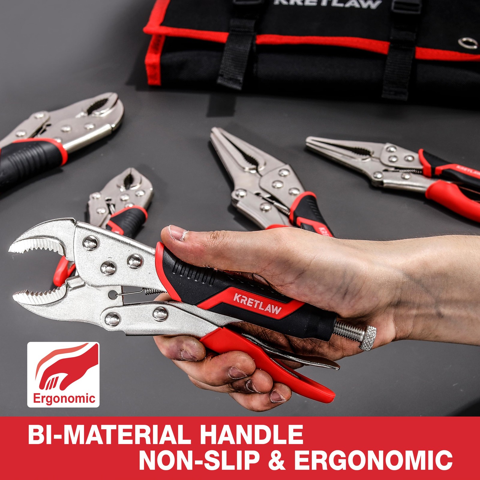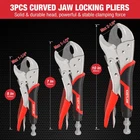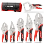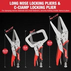 About this item Versatile Locking Pliers Set: Includes 5", 7", and 10" curved jaw pliers (max jaw capacities of 1-1/4", 1-1/2", and 2-1/8"), 6-1/2" and 9-1/2" long nose pliers (max jaw capacities of 2-1/8" and 4-1/16"), and a 6" C-clamp (jaw capacity of 2"). Note: Pliers are coated with protective oil for rust prevention; simply wipe before use and store in a dry place. Adjustable Pressure & Quick Release: Features an adjustable tighten screw for precise jaw openings and a quick-release lever, allowing for easy adjustments and immediate jaw closure when storing. Comfortable, Non-Slip Handle: Designed with a dual-color TPR handle, offering an ergonomic, lightweight, and non-slip grip for reduced hand fatigue and easier handling. Wide Range of Applications: Ideal for various tasks such as loosening nuts and bolts (curved jaw pliers), gripping small fasteners or narrow materials (long nose pliers), and clamping or holding tapered materials or edges (C-clamp). Compact Roll-Up Storage Pouch: Crafted from durable black 600D fabric with 6 internal pockets and a secure buckle, the storage pouch ensures organized, space-saving storage and portability.