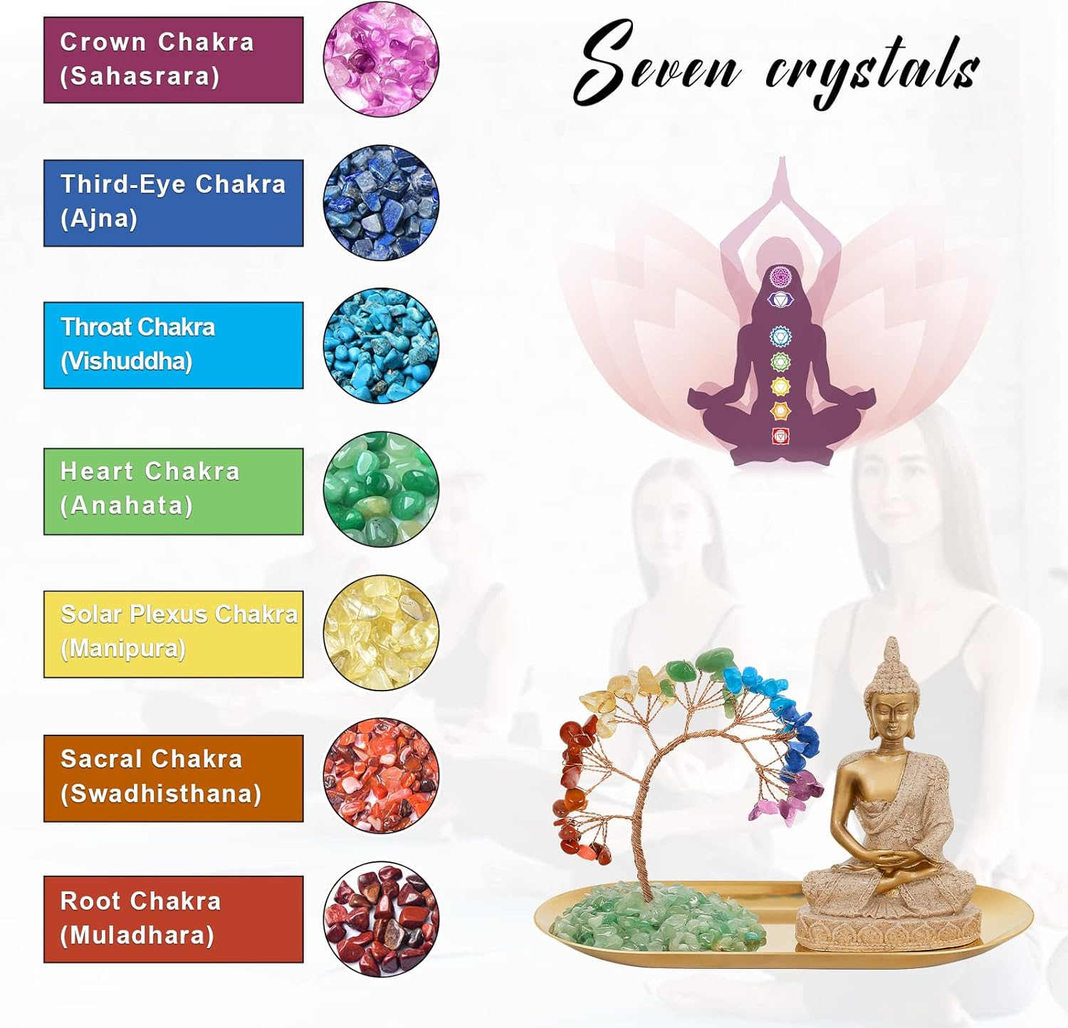 EXQUISITE ARTWORKS:This exquisite piece of art is a combination of 7 chakra crystal tree, stainless steel golden tray and golden Buddha Shakyamuni. The money tree is handcrafted by artisans. leaves and branches are adjustable and you can shape them in whatever way you want. Put it in your living room or on your desk. It will help you attract wealth and prosperity, success and all good things. CRYSTAL TREE BUDDHA STATUE:Zen decorative Buddha statues Size: 3x2x4.3 (LxWxH), in sitting meditative pose. Made of high quality sandstone and resin materials, hand-colored by artisans. Statues can be placed in your home, office, dining table, meditation room, prayer room, sacred room, yoga room, desk, it can bring you a relaxing and peaceful atmosphere. 7 CHAKRA CRYSTAL TREE:The 7 chakras are the energy centers of our body. An unbalanced energy field can cause blockages in the flow of energy. We regulate in the proper way, and meditation is the best way to regulate. The 7 chakras are the bottom chakra, the navel chakra, the abdomen chakra, the heart chakra, the throat chakra, the eyebrow chakra, and the crown chakra. So you can correspond to different chakras according to the color of the crystal. GREAT GIFT:Money tree can bring you good luck and wealth, and enhance the power of the person or the surrounding environment. Whether it's a birthday, Valentine's Day, Mother's Day, housewarming, Christmas or anniversary, it's a perfect present for your family, friends and colleagues. This is an absolutely beautiful, and meaningful gift for anyone. Note: You will receive folded branches due to packaging. A unique but similar tree will be yours. As the cash cow decor is made of natural stone, colors and shapes vary and may differ slightly from the pictures. We provide free return and exchange guarantee for your purchases for up to three months. During this period, you can contact us at any time if you encounter any problems. Product Description Place the chakra crystal tree in your living room and office desk, it will bring you wealth, good luck, wish you success and attract positive energy. YOGA MEDITATION STATUE 7 Chakras Office Meditation Accessories Crystal Home Decorations for cubicle office decor, kitchen decor, desk decoration, table decor, shelf decorations, Zen Spiritual Decor, yoga decor, meditation room decor, crystal decor, chakra decor, feng shui decor, statues for home decor, room decoration, spiritual decor etc. The Crystal Tree Buddha Statue is a wonderful Feng Shui gift for family and friends, especially for meditation lovers, yoga lovers, Feng Shui masters and Buddhists. The video showcases the product in use. The video guides you through product setup. The video compares multiple products. The video shows the product being unpacked. 7 Chakras Yoga Meditation Sculpture The crystal money tree will help you attract wealth, prosperity, success and all good things. Buddha Statue Gives you peace of mind, helps you overcome difficulties, and keeps your loved ones healthy happy. Yoga Meditation Statue The small yoga statue is perfect for display in Zen accessories, yoga, meditation room, office. 1 Buddha Decor 2 Office Desk Decor 3 Meditation Room Decor 1 DIY 2 SEVEN CHAKRAS A SPECIAL BLESSING GIFT The Seven Chakras Crystal Tree Buddha Statue can also be used as a blessing gift, wishing health, safety and happiness to relatives and friends around you. It's also a great gift to help your friend heal himself when he's in trouble. Our Product Material Resin Material Resin Material Resin good luck gift ✔ good luck gift ✔ good luck gift ✔ Our Product Add to Cart Add to Cart Add to Cart Add to Cart Customer Reviews 4.5 out of 5 stars 1,310 4.5 out of 5 stars 1,310 4.5 out of 5 stars 1,310 4.5 out of 5 stars 1,310 — 4.5 out of 5 stars 60 4.5 out of 5 stars 60 Price $8.98 $ 8 . 98 $9.99 $ 9 . 99 $9.98 $ 9 . 98 $8.98 $ 8 . 98 — — — Color Black White Gold Sandstone Gold Black Silver Material Resin Resin Resin Resin Resin Resin Resin Best Gift ✔ — — ✔ ✔ ✔ ✔ Home Decor ✔ — — ✔ ✔ ✔ ✔ Size 3.14"L x 5.12"H 3.14"L x 5.12"H 3.14"L x 5.12"H 3.14"L x 5.12"H 1.57"L x 2.56"W x 6.9"H 1.57"L x 2.56"W x 6.9"H 1.57"L x 2.56"W x 6.9"H
