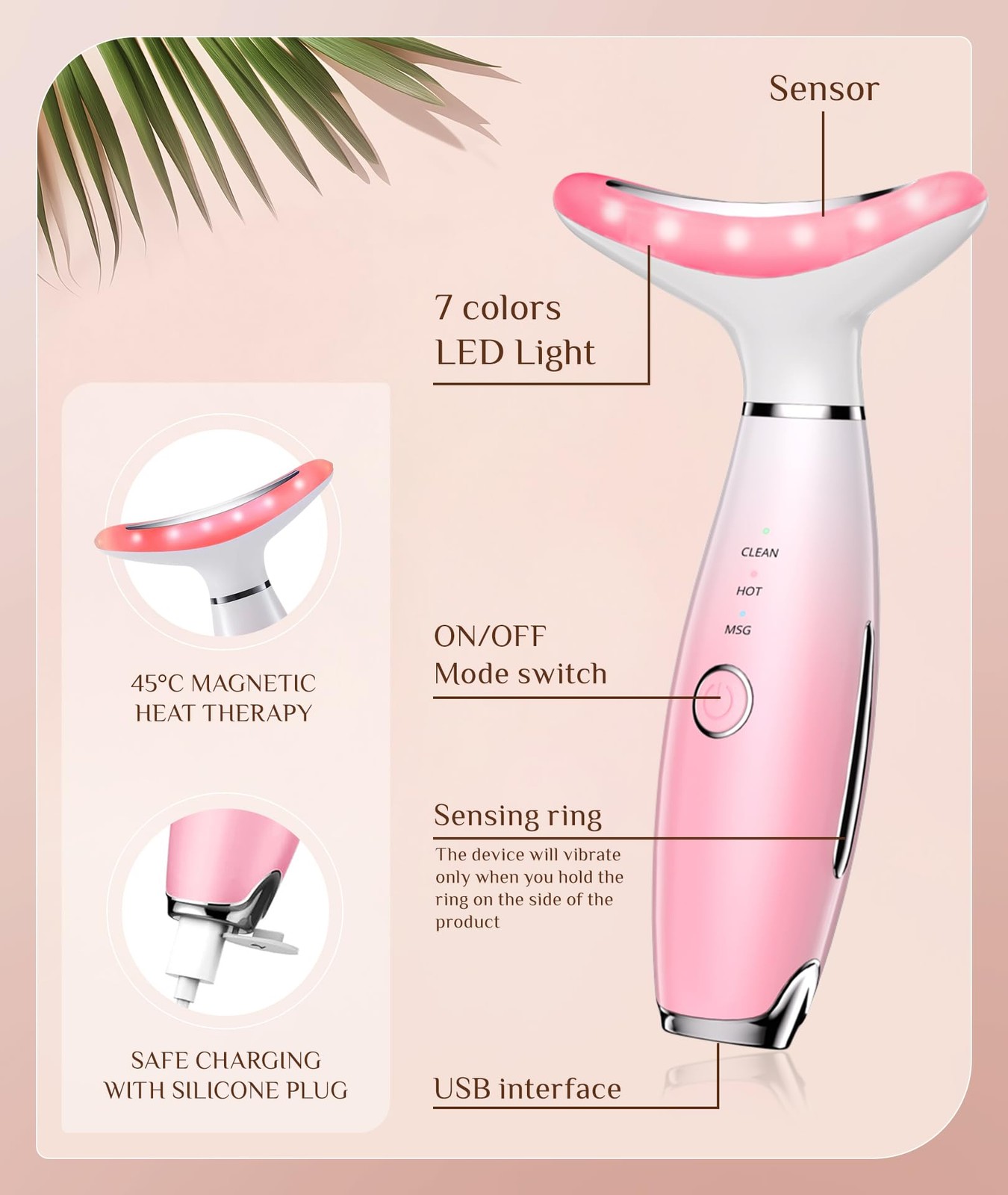 7 Color Galvanic Machines - Red Light Therapy for Face and Neck, Face Massager Tool for Wrinkles, Double Chin, Vibrating Facial Massager with Thermals, Pink Trinity Galvanic Machines: This micro-current facial device has 7 color modes. With gentle vibration and 113℉ heating, this facial sculptor is effective in treating double chins, wrinkles, etc How to Use: Cleanse the face and apply some skincare products before use. Press and hold the button to power on and select the mode you need. Hold the sensing pieces on both sides and place the sensor on your skin, the device will start vibrating. It is recommended to use once or twice a day for five to ten minutes Portable Design: This red light therapy wand is lightweight so that you can take it with you and use it anywhere Ideal Present: This face massager tool is suitable for all skin types and nicely packaged, which makes it a decent present for any occasion such as Mother’s Day, Father’s Day, Birthday, Christmas, etc 24/7 Service: Please contact us if you have any problems and we will get back to you within 24 hours to help you out