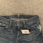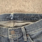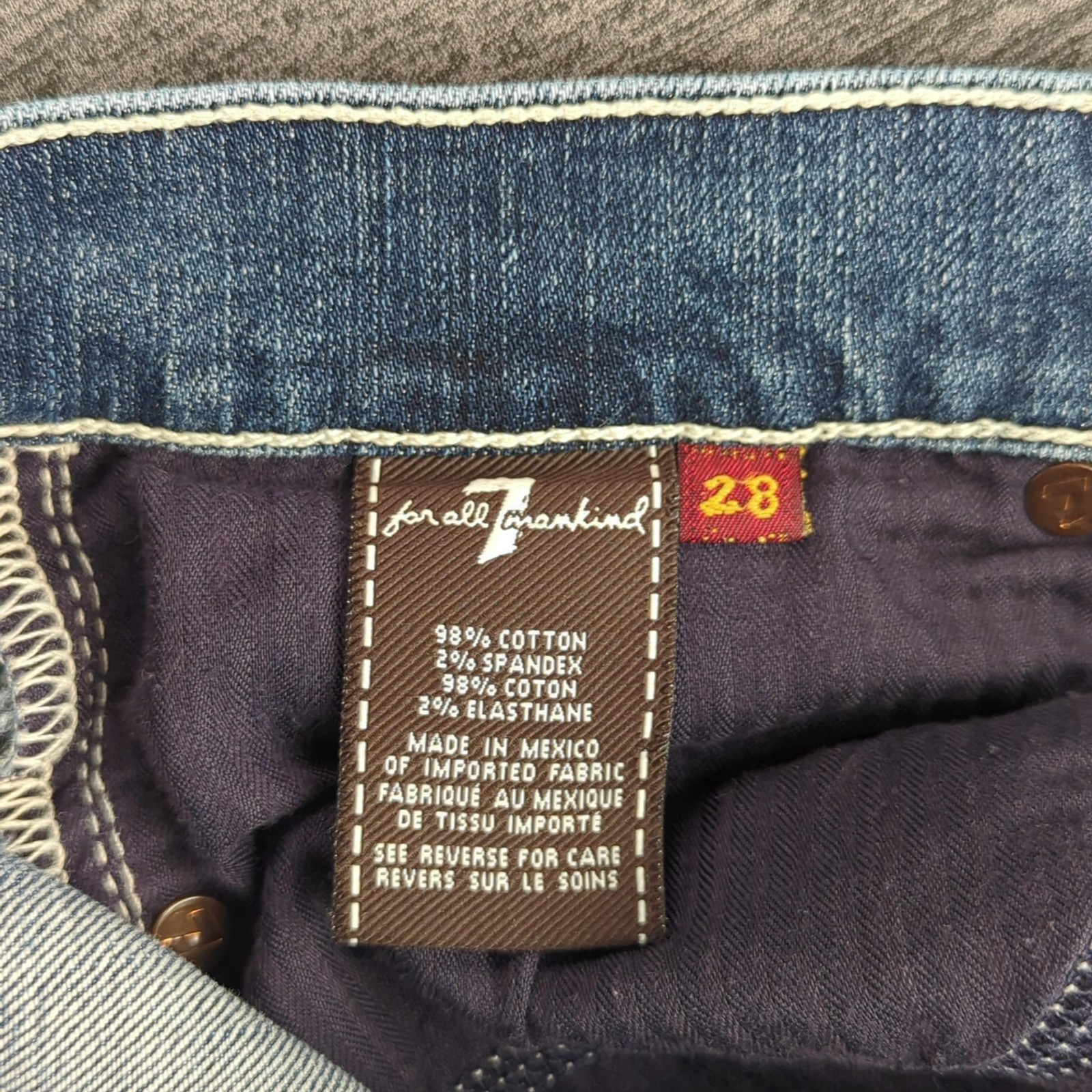 Brand: 7 For All Mankind Style: Straight Leg denim jeans in a medium blue wash Gender/Size: Womens 28 Fabric: 98% cotton, 2% spandex/elastane for comfortable stretch Made in Mexico of imported fabric Features: 5-pocket styling, zip fly with button closure, subtle whiskering and fade Notes: Sizing can vary by brand; compare to a similar pair for best fit.