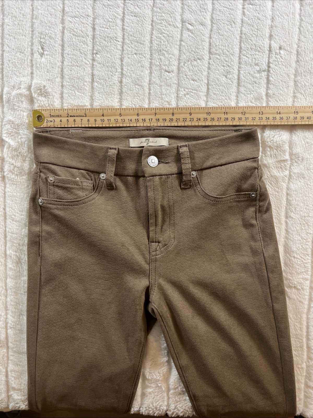 The product is a pair of 7 For All Mankind Women's Snake Print Skinny Jeans in size 25. These jeans feature a button-zip fly closure, a mid-rise waist, and are made from a cotton blend material. The jeans are in a stylish reed coated color with a snake print theme, perfect for the winter season. Made by 7 For All Mankind, these jeans have a 25-inch inseam and are designed for a regular fit for women who wear size 25.