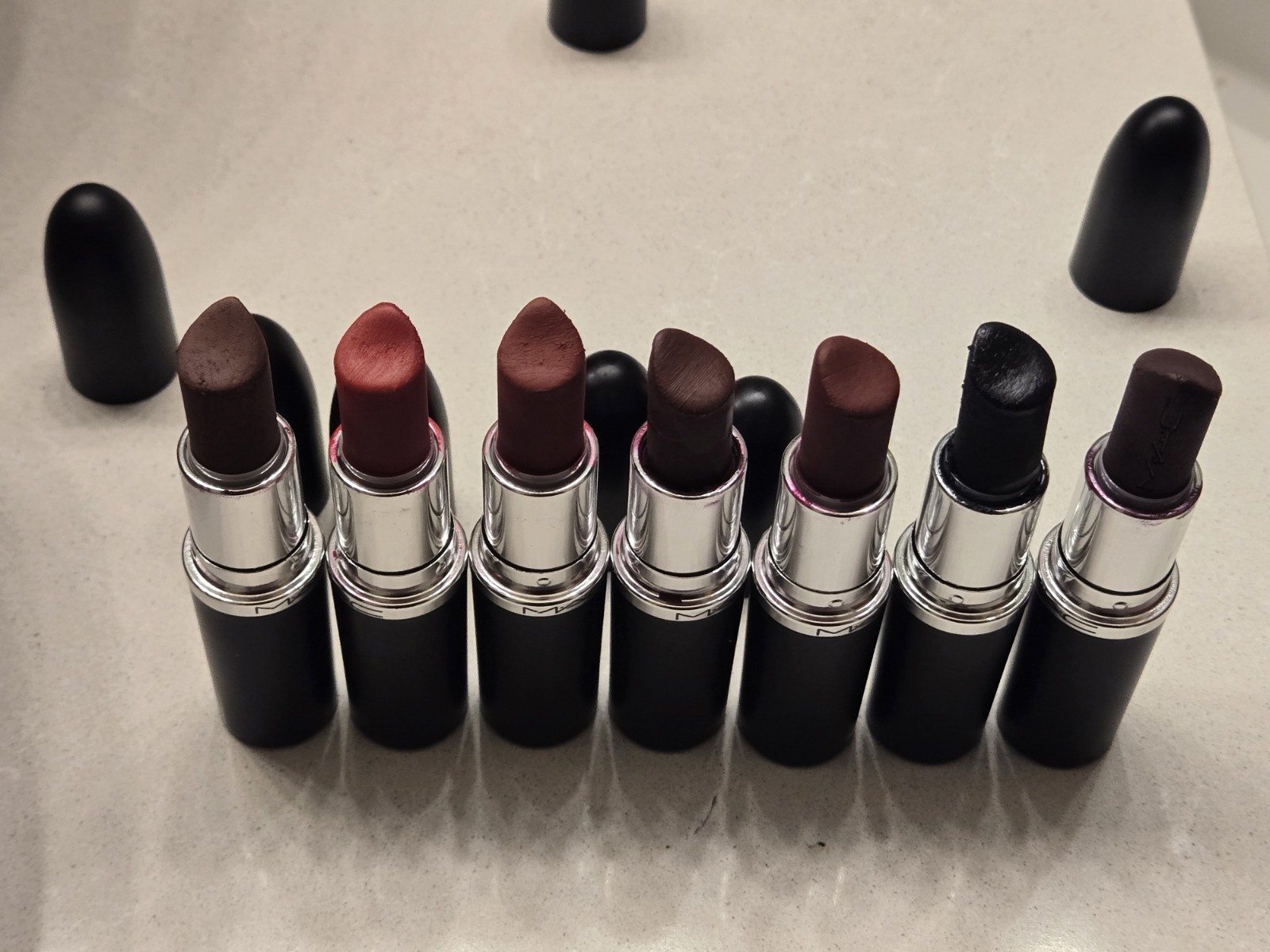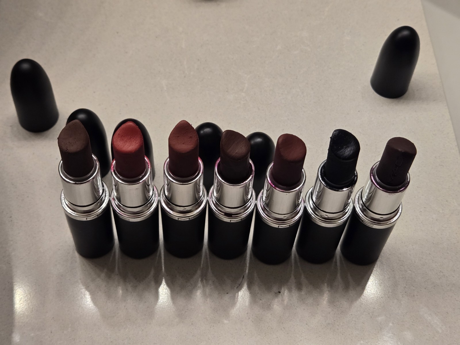 7 Mac Matte Lipstick Bundle plus 2 Mac Liquid Lipstick - See photos for amount of usage - From left to right Mac Matte Lipstick - Antique Velvet Mac Matte Lipstick - Russian Red Mac Matte Lipstick - Avant Garnet Mac Matte Lipstick - Sin (No Label) Mac Matte Lipstick - Diva Mac Matte Lipstick - Caviar Mac Matte Lipstick - Smoked Purple Mac Liquid Lipstick - High Drama Mac Liquid Lipstick - Caviar See photos for swatches of each color, happy to provide more photos if needed.