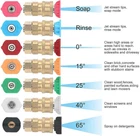 Pressure washer tips set is easy to set up. had all the different pressure washer nozzles, easy to remove And replace from washer nozzles. 7 Pieces Set - 7 Different Spray Angle Modes, includes 4pcs high pressure stainless steel quick connect spray nozzles, Red nozzle tip 0°, Yellow nozzle tip 15°, Green nozzle tip 25°, White nozzle tip 40°, and 1pcs Black Brass nozzle tip 65°, and 2pcs jet stream tips (Blue tip for rinse mode, Pink tip for soap mode) 7 Different Nozzles angle tip Choose different angles spray nozzle according to the actual need, such as watering flowers and plants, washing car, washing fence and cleaning sidewalk, and can be attached to a quick-connect wand for swifter application and more Universal pressure washer accessories fit for most leading brands such as Sun Joe, AR Blue, Simpson, Greenworks and more. Each easy fitting nozzle tip is designed for usage on a different outdoor surface Pressure washer tips set is easy to set up. had all the different pressure washer nozzles, easy to remove And replace from washer nozzles Attached to a 1/4 inch Quick-Connect Wand Perfect for almost all brand of pressure washers up to 4000psi Make sure working pressure of your pressure washer is higher than 1720 psi while using two jet stream tips(blue and pink tips). The higher pressure you have, the further water will reach to clean.