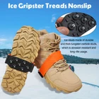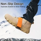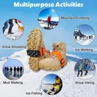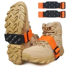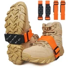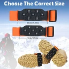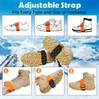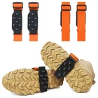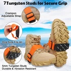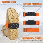 Mid-Sole Ice Cleats fasten around most all shoes and boots. The studs dig into the ground to minimize the likelihood of slipping on dry, snow-covered, full icy, or partial icy surfaces. Industrial Meterial : Rubber+Tungsten studs+Fabirc straps Size: Medium fit for women's boot and shoes Large fit for men's boot and shoes Benifits: Walk safer on slippery snow and ice. Makes outdoor work and play safer. Can be worn while drive Rotate when indoors Reduce the risk of harmful falls that cause injuries or even death. They grab traction on ice, bites into packed snow, and improves footing in winter conditions. Description: The Ice Traction Cleats are ideal for many conditions. They are crafted with an elastic strap to ensure a one-size-fits-all design. They will fit over footwear of all shapes and sizes. They are a great addition to your ice fishing gear, hiking gear, and winter boots. 7 tungsten studs are integrated on each cleat pad, which will assist in navigating cold, icy, and slippery terrain. They can also be turned around when you go indoors so that the spikes face upward, eliminating the need for them to be taken on and off frequently. The tread pattern on these snow spikes for shoes is constructed to provide excellent traction for all types of outdoor activities or job sites. They are intended for use in cold temperatures and will remain strong and flexible even in subzero conditions. They are great for construction workers, landscapers, loggers, delivery personnel, those who play winter sports, and more. These traction cleats are designed with orange straps and black treads.