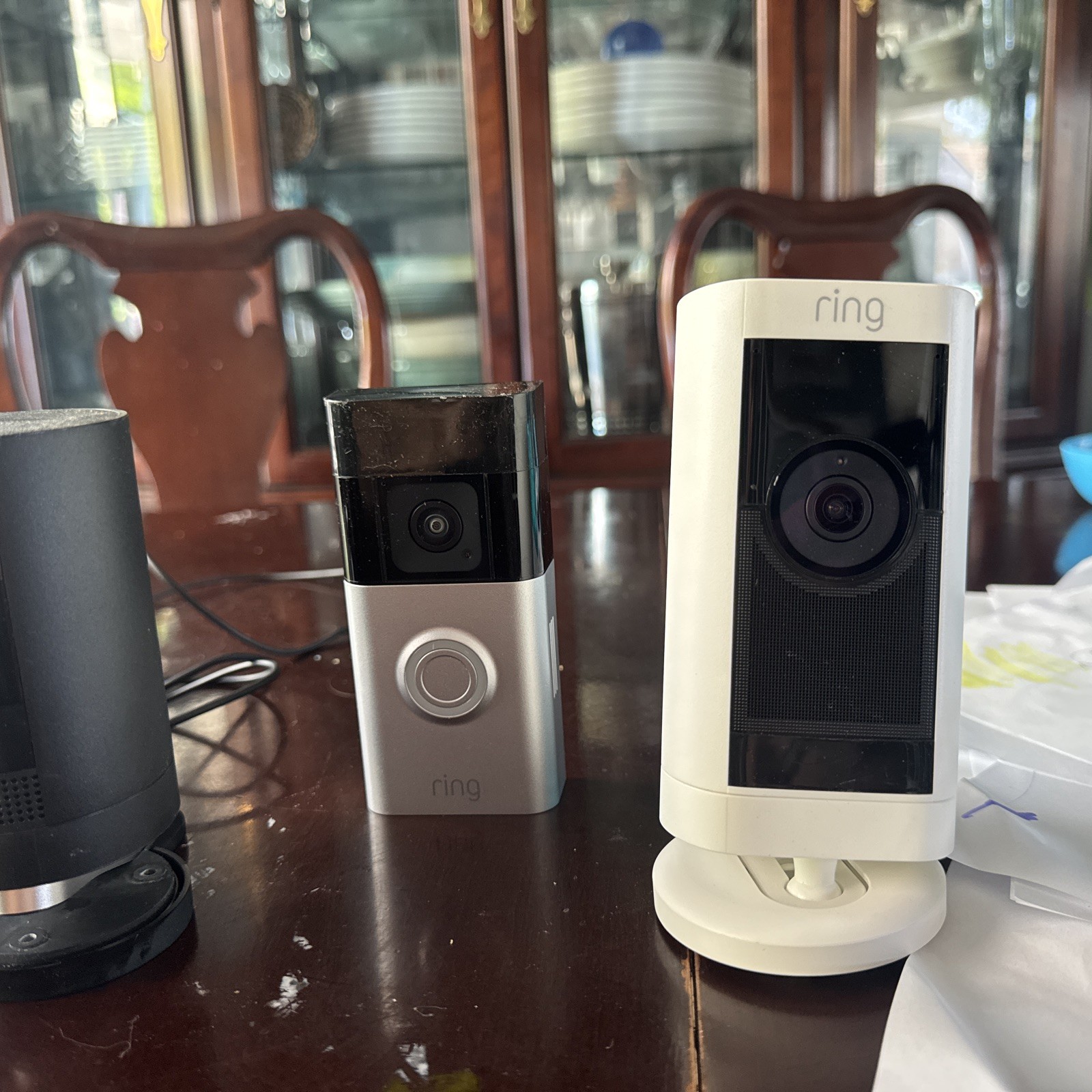 7 pieces of Ring Doorbell Equipment. 6 wireless devices with battery packs included. (2 doorbells, 4 free standing or mountable cameras) 1 corded Ring device. Also includes an extra mount kit for stick up cam. Not tested, but they all were functional when taken down