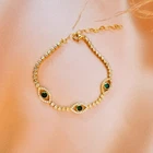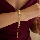 This 7 ct Round Cut Simulated Emerald Evil Eye Tennis Bracelet is a stunning piece of jewelry perfect for various occasions such as engagements, weddings, anniversaries, and birthdays. The bracelet features a beautiful green simulated emerald main stone with a round shape and excellent cut grade. It is made of sterling silver with a 14k yellow gold plated finish, making it a durable and long-lasting accessory. The bracelet is handmade, adjustable, and nickel-free, with a lobster closure for easy wearing. The evil eye design adds a touch of beauty and protection to the overall appeal of the piece.