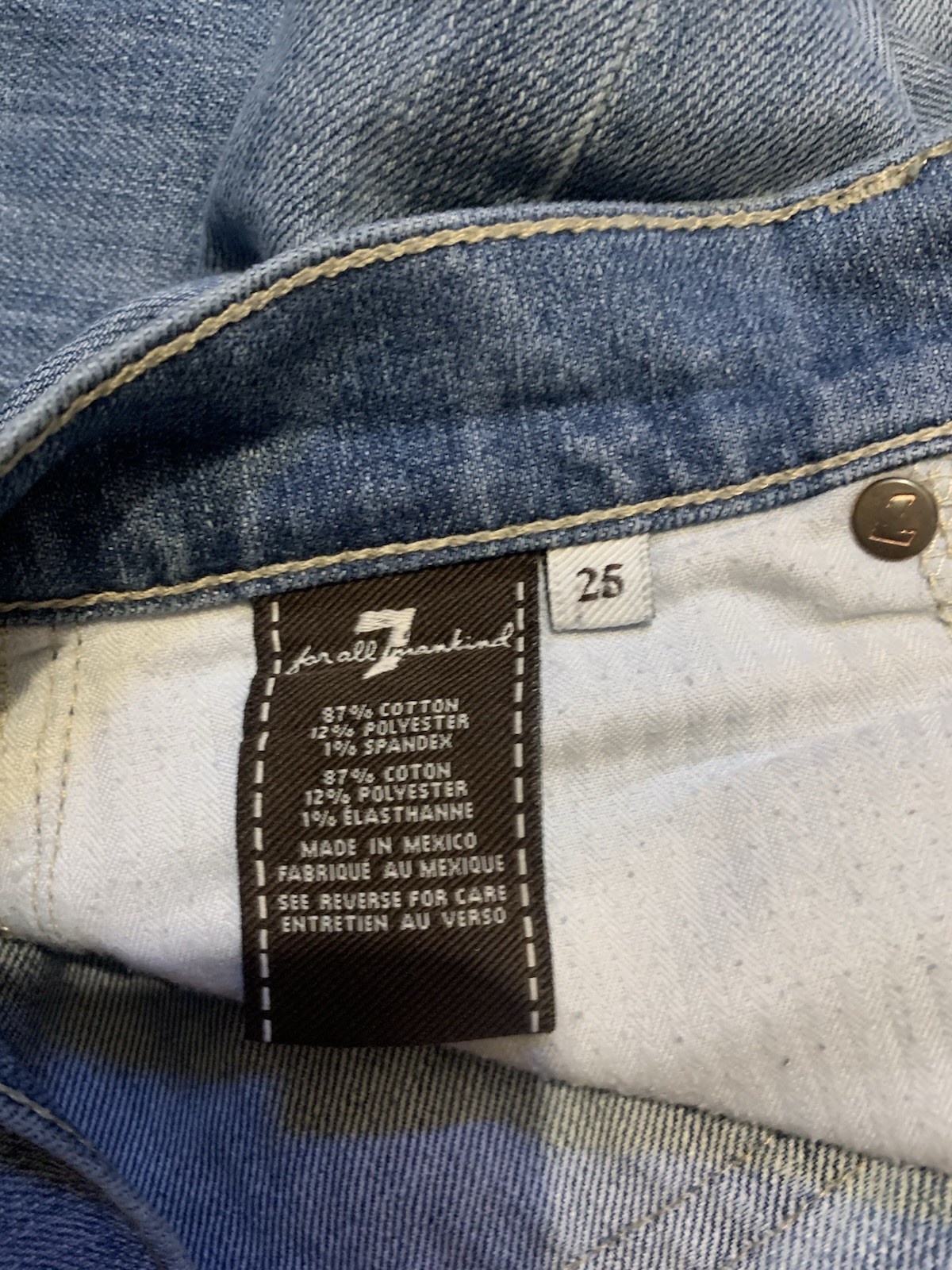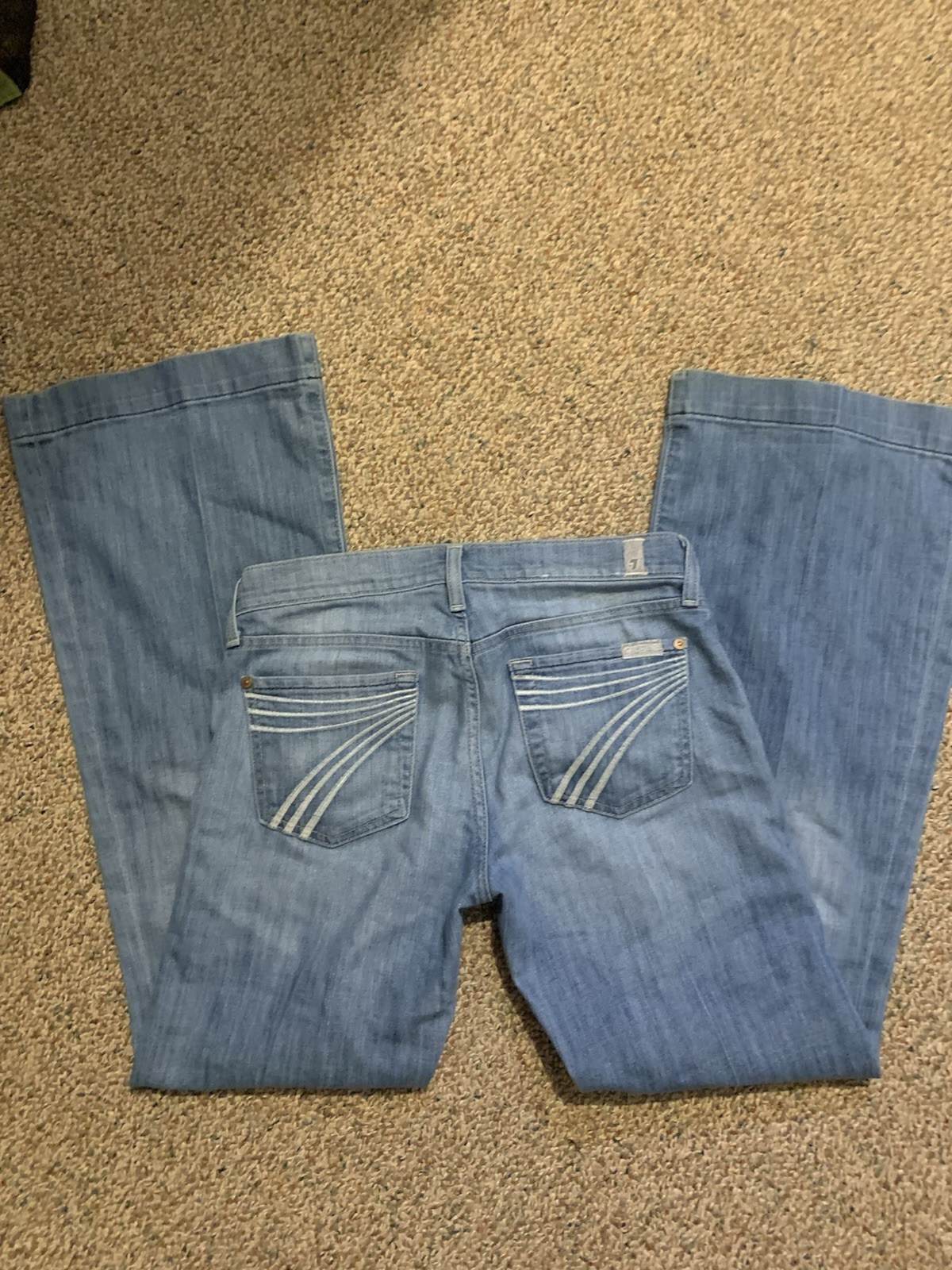 The 7 For All Mankind Dojo Jeans are a stylish pair of women's jeans in a flared style with a mid rise and a 31-inch inseam. Made from denim fabric with a cotton material, these jeans feature a zip closure, 5-pocket design, and solid blue color with a logo accent. Machine washable for easy care, these jeans are perfect for the fall and spring seasons. The size 25 jeans have a regular fit and are part of the 7 For All Mankind brand's collection.