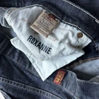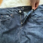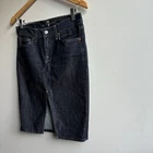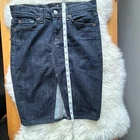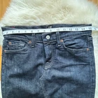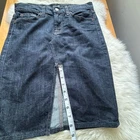 7 for All Mankind presents the Roxanne Women's Denim Skirt in a dark wash, size 26. This knee-length skirt features a front slit with a stylish button and zipper closure, perfect for any casual, party, or travel occasion. Made from a blend of Lycra, cotton, and denim fabric, this straight and pencil style skirt boasts a mid-rise fit and practical pockets. Embrace a mix of American, Canadian, and bohemian themes with this versatile piece, suitable for all seasons and handmade in the United States. Elevate your wardrobe with this chic and timeless addition that exudes a rustic, retro vibe. PLEASE NOTE: item is in excellent condition and has been washed.
