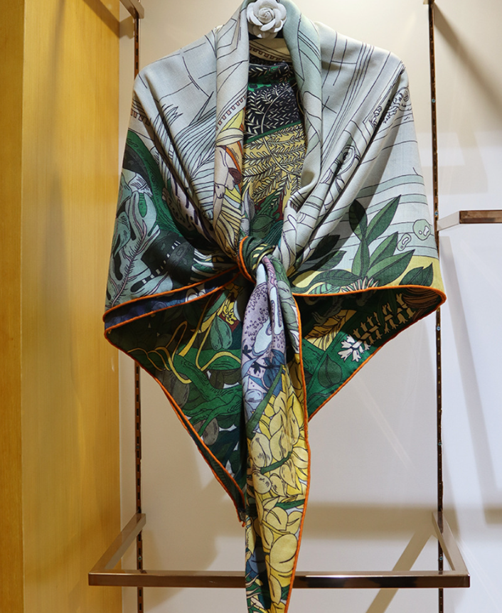 $ 362.2170% Cashmere 30% Silk Double Face Scarf with Flower Totem Print 53'' Wrap Bandana